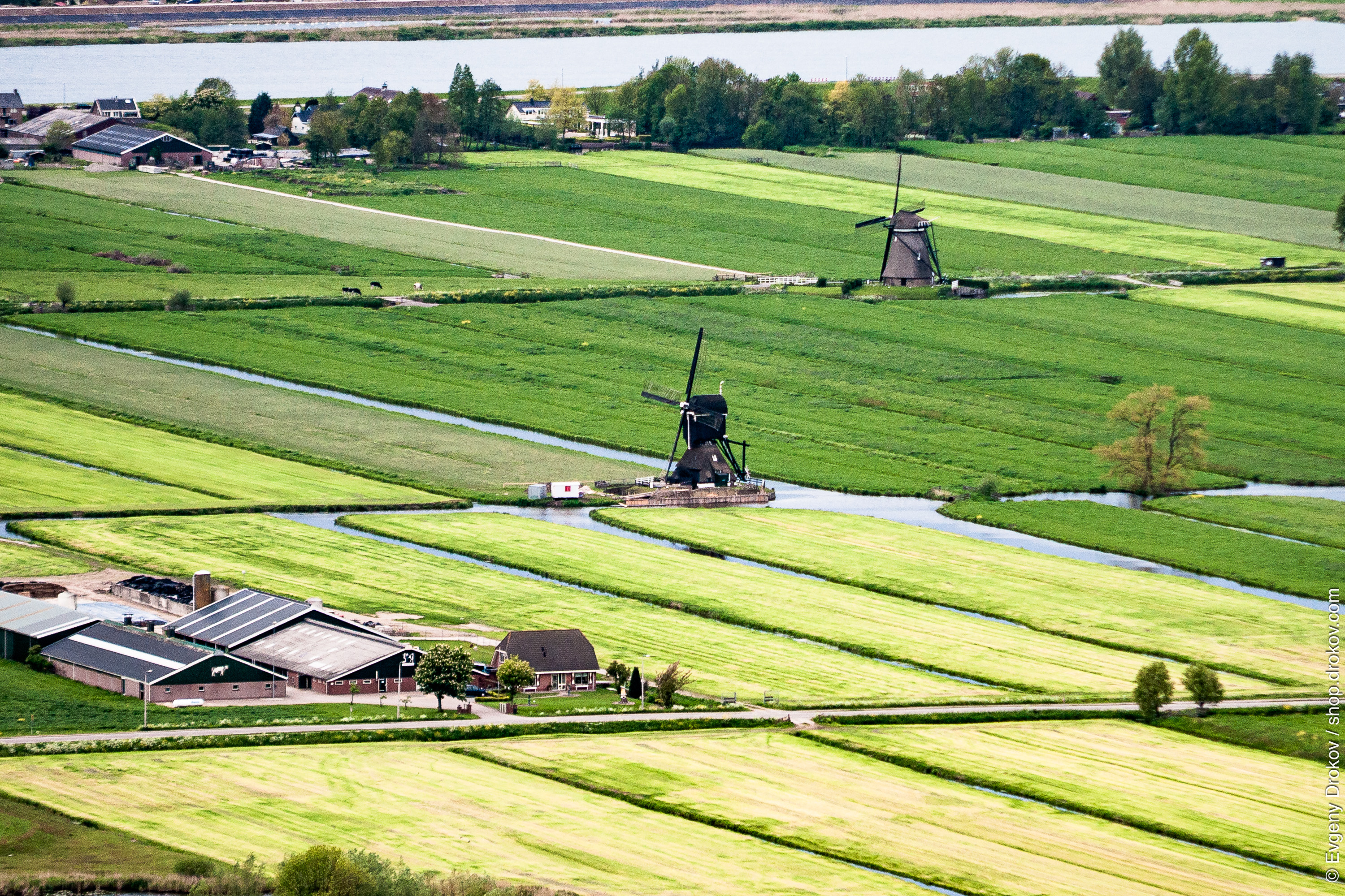 An aerial perspective captures a hot air balloon's journey from Ridderkerk to Noordeloos, observed over Bleskensgraaf, South Holland, The Netherlands. This vantage point showcases the picturesque Dutch landscape, highlighting traditional windmills and vibrant green fields.