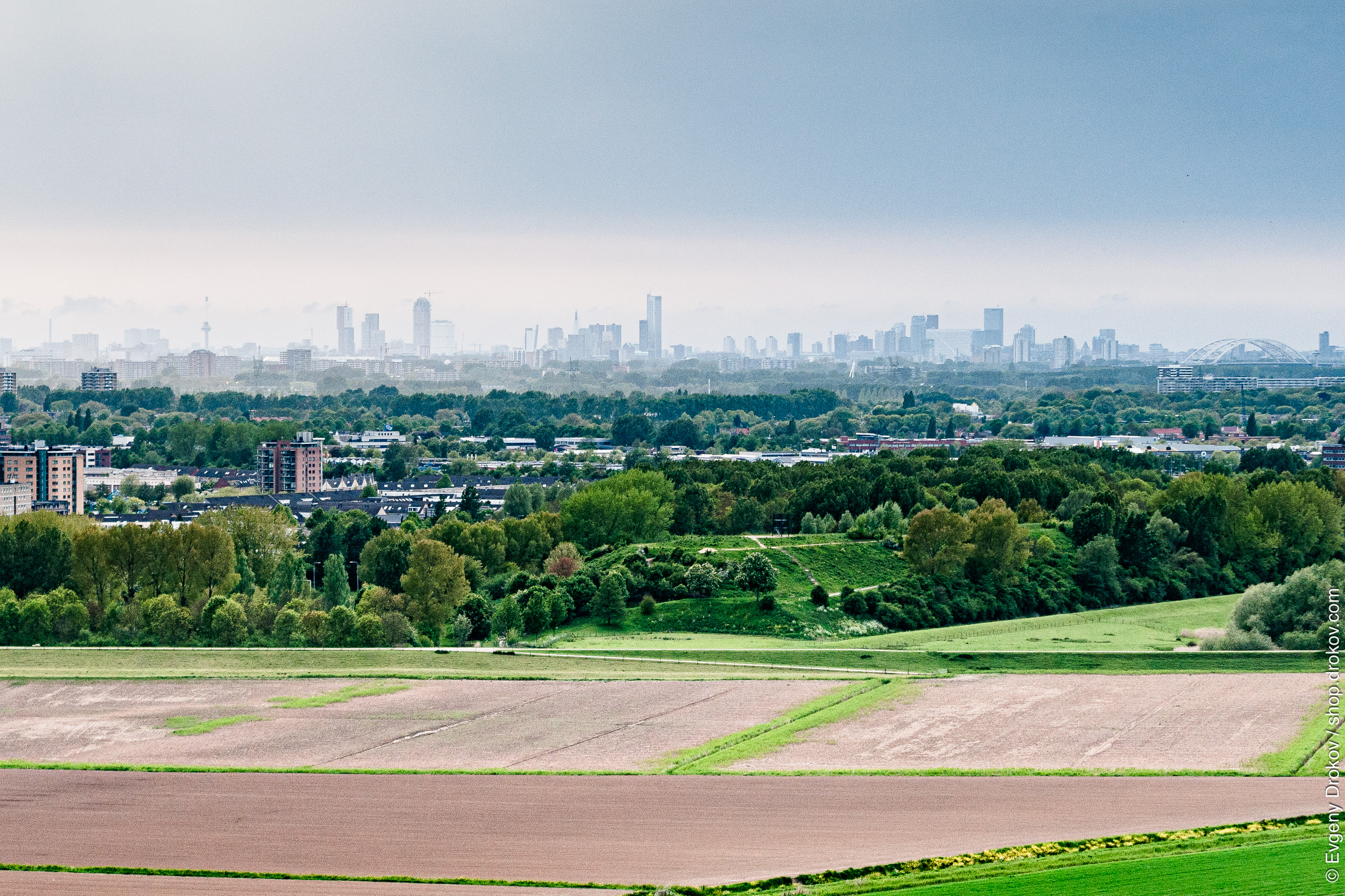 An air balloon ascends over Alblasserdam, South Holland, The Netherlands, on a flight from Ridderkerk to Noordeloos. This aerial perspective captures the transition from rural landscapes to the distant urban skyline.