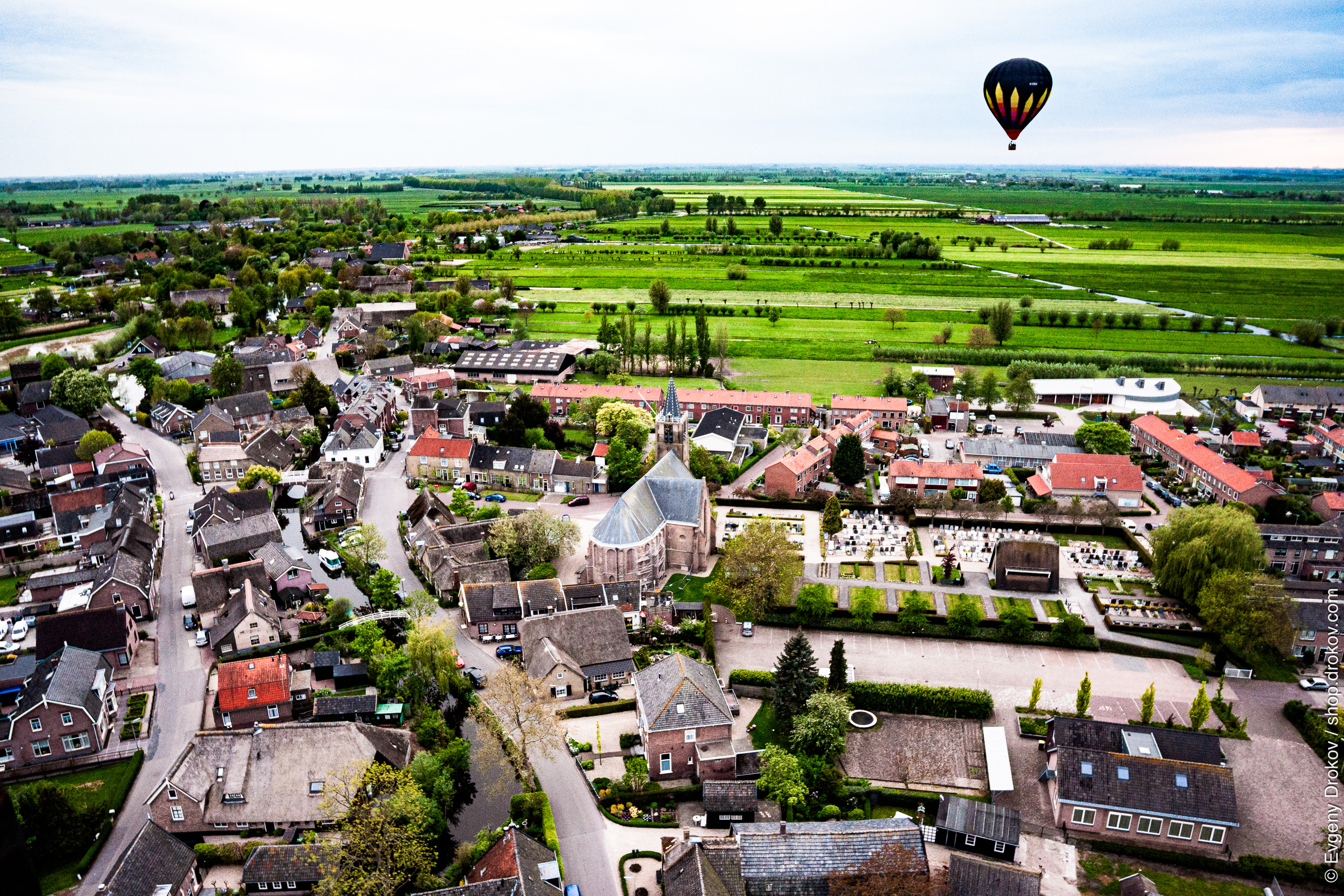 An air balloon embarks on a flight from Ridderkerk to Noordeloos, captured here over the Dutch village of Noordeloos in South Holland. This aerial perspective showcases the charming landscape and architecture.