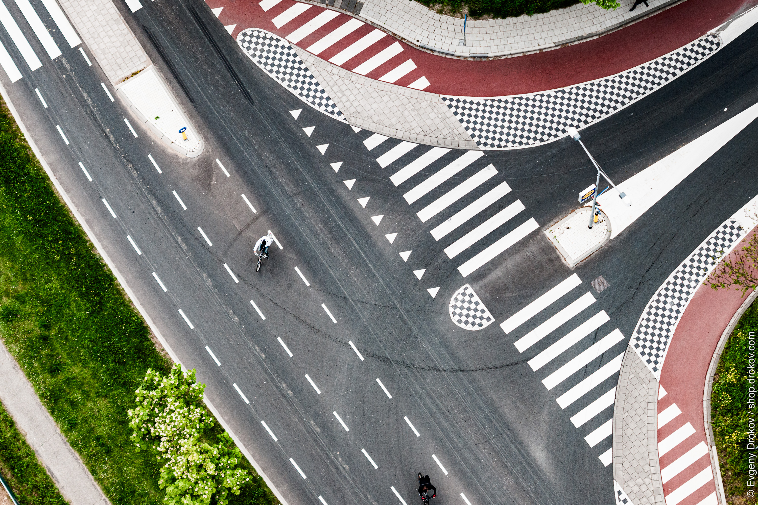 An aerial perspective captures cyclists navigating a road intersection in Alblasserdam, South Holland, The Netherlands. This view highlights the infrastructure designed for safe and efficient urban mobility.