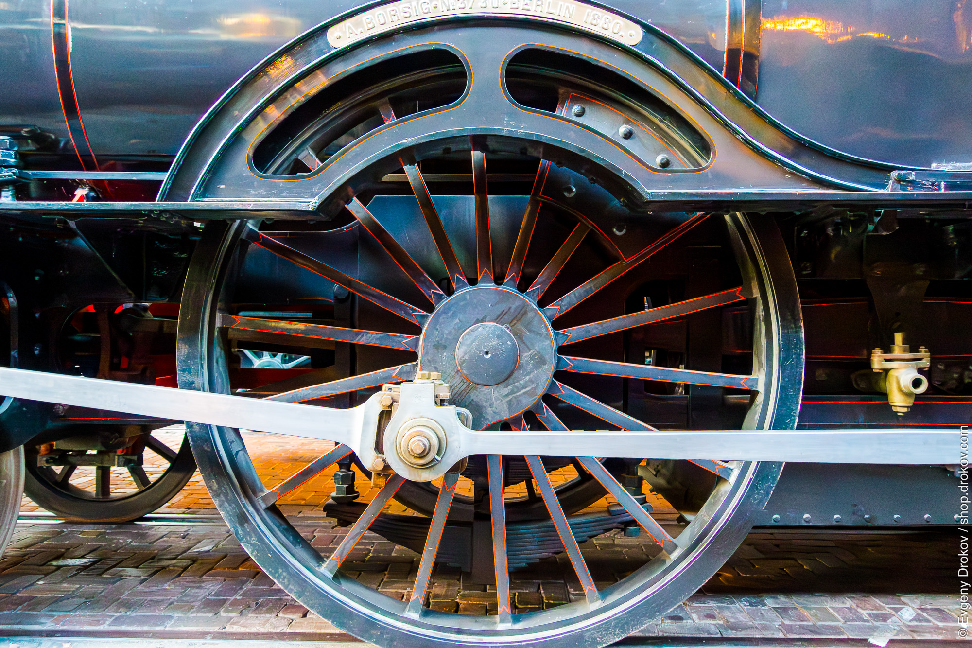 This is a close-up of a historic steam locomotive wheel at the Railway Museum in Utrecht, Netherlands. The inscription "A. BORSIG - N° 373 - BERLIN 1880" confirms its origin and age, showcasing a piece of industrial heritage.