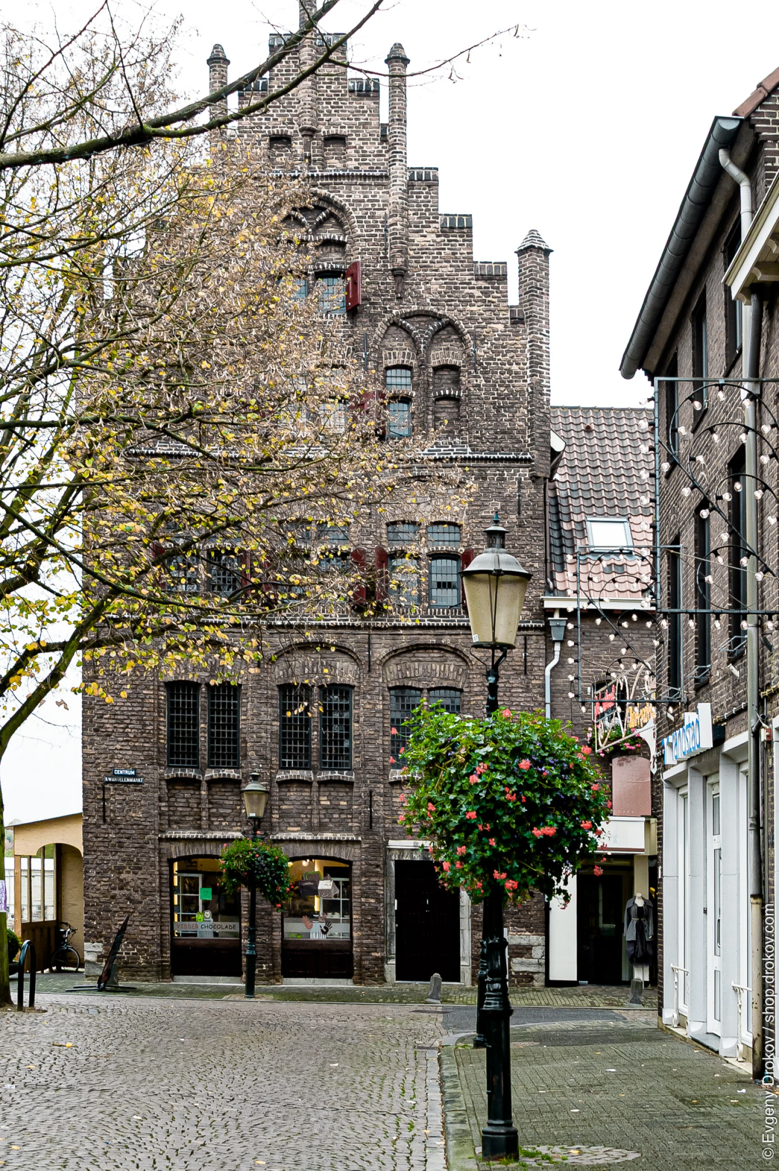 A historic brick building stands on a cobblestone street, adorned with autumn foliage and blooming flowers. The architecture, with its stepped gables and arched windows, speaks of centuries past. This enduring structure, a testament to time, invites contemplation of its rich history and the stories held within its walls.