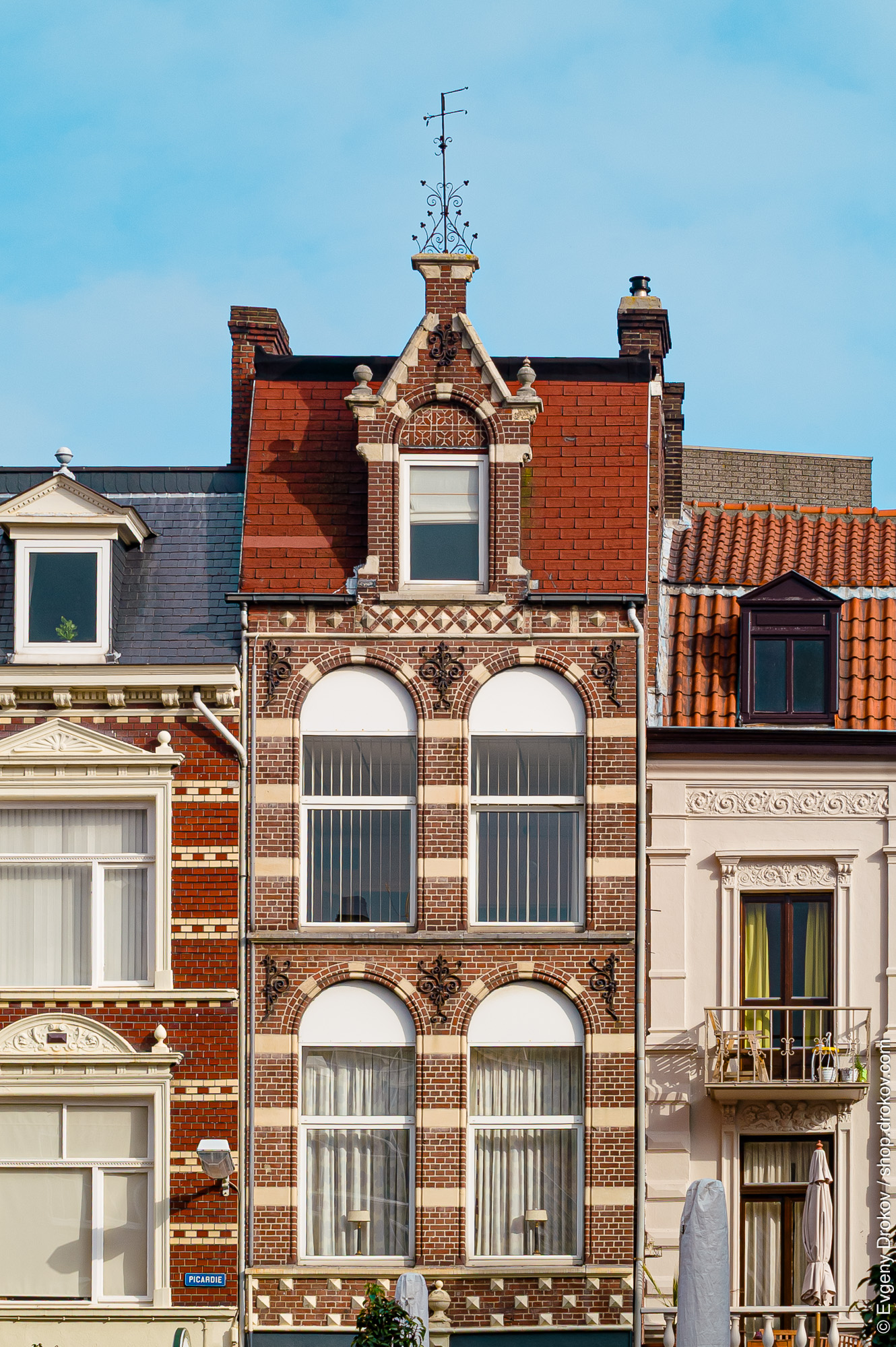 A meticulously crafted, historic building facade. Ornate brickwork and arched windows showcase the architectural details of a European city. The contrasting colors and textures of the brick and stone create a visually appealing scene.