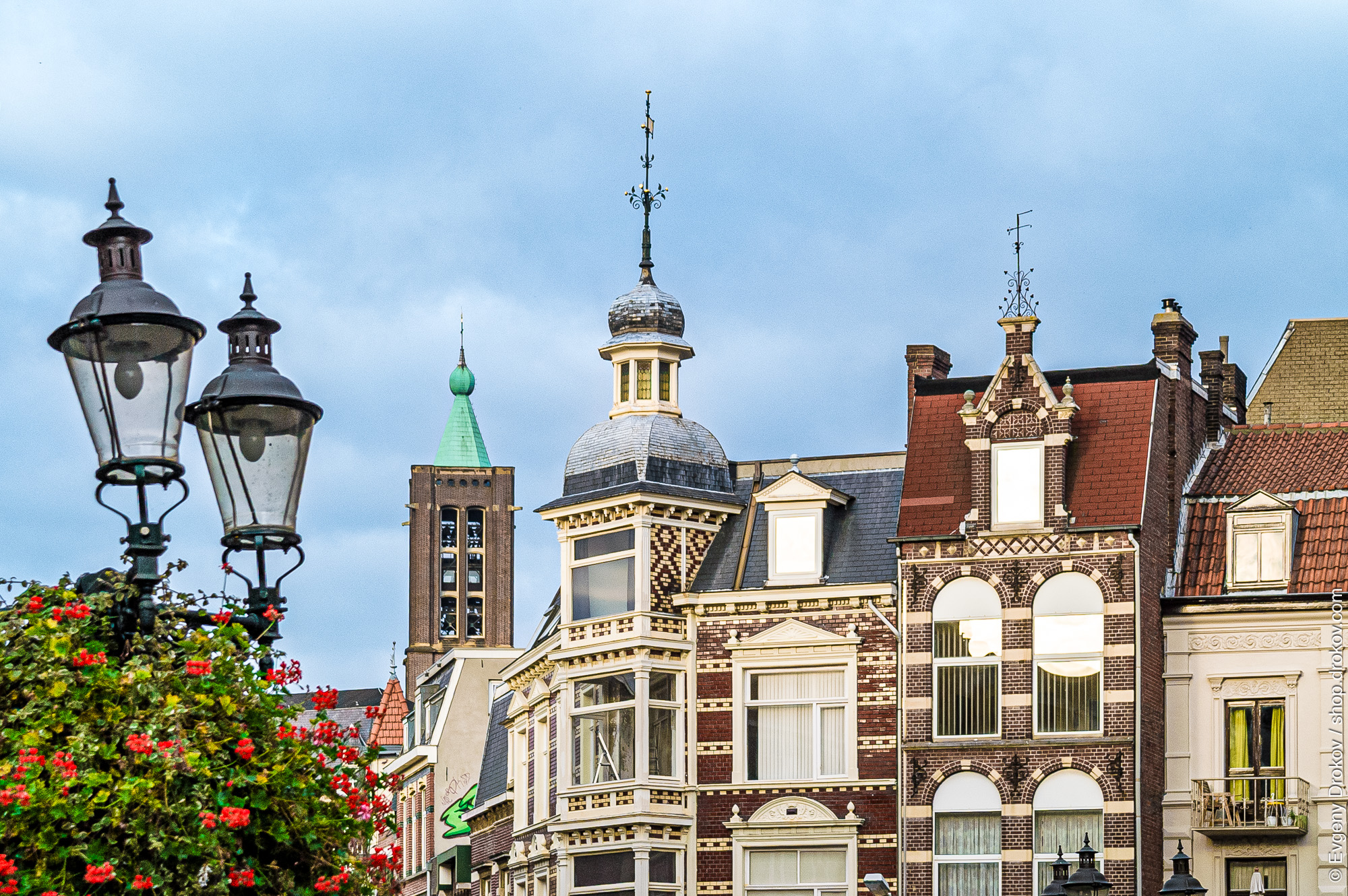 Ornate brick buildings line a European street. Antique-style street lamps, adorned with vibrant flowers, stand guard. The architecture showcases a rich history of Venlo and meticulous craftsmanship.