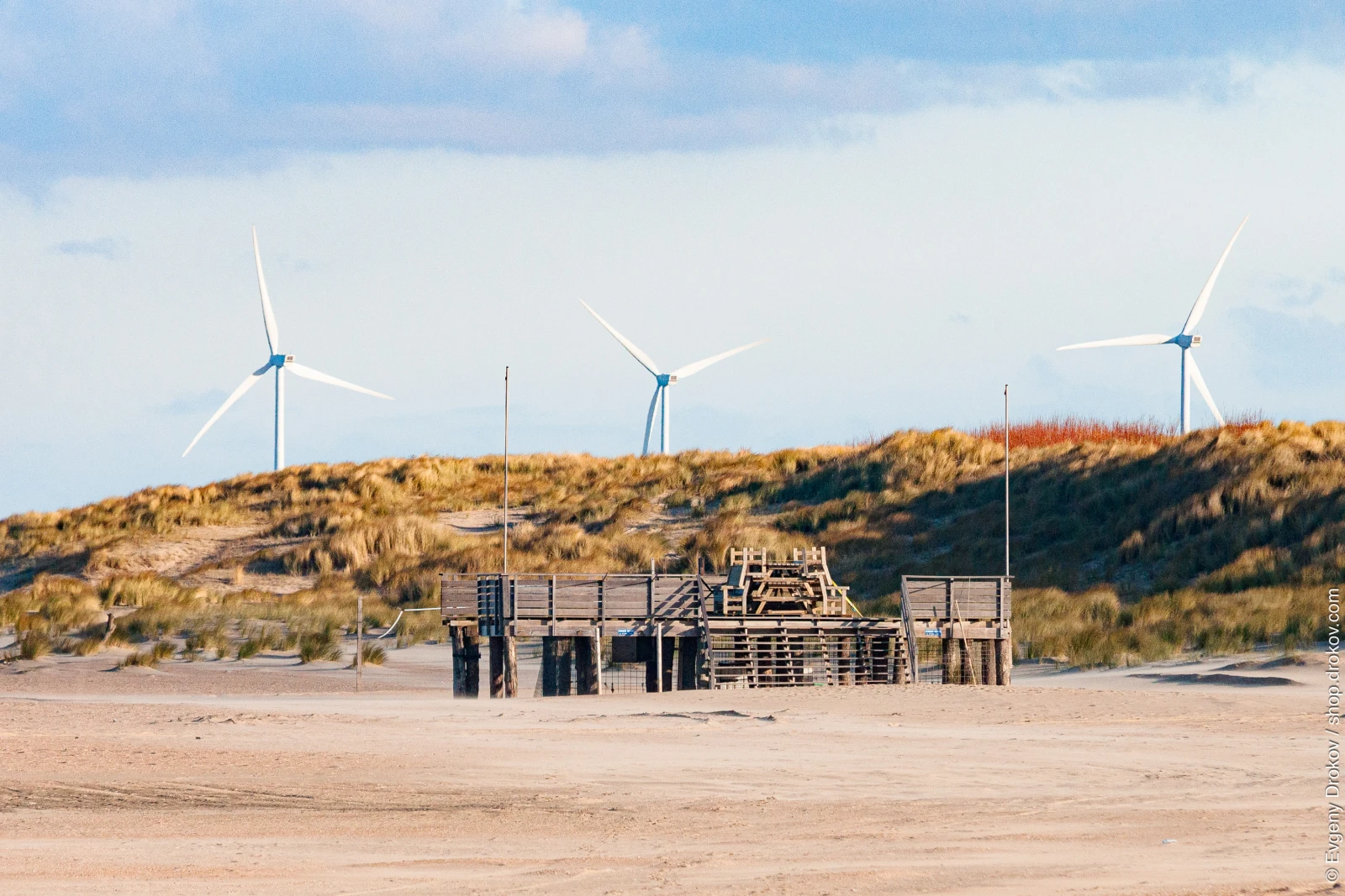 Wind turbines stand sentinel over the dunes of Veere, Zeeland, The Netherlands, a testament to sustainable energy generation on the Netherlands Coast Line. The wooden structure on the beach provides a vantage point to appreciate this blend of nature and technology.