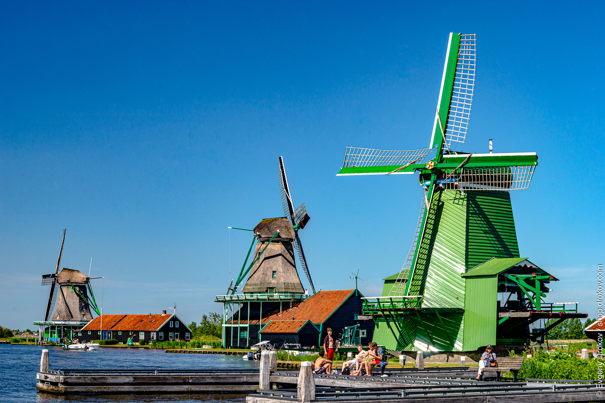Visitors enjoy a sunny day at Zaanse Schans, North Holland, The Netherlands, a historic open-air museum showcasing traditional Dutch windmills and architecture.
