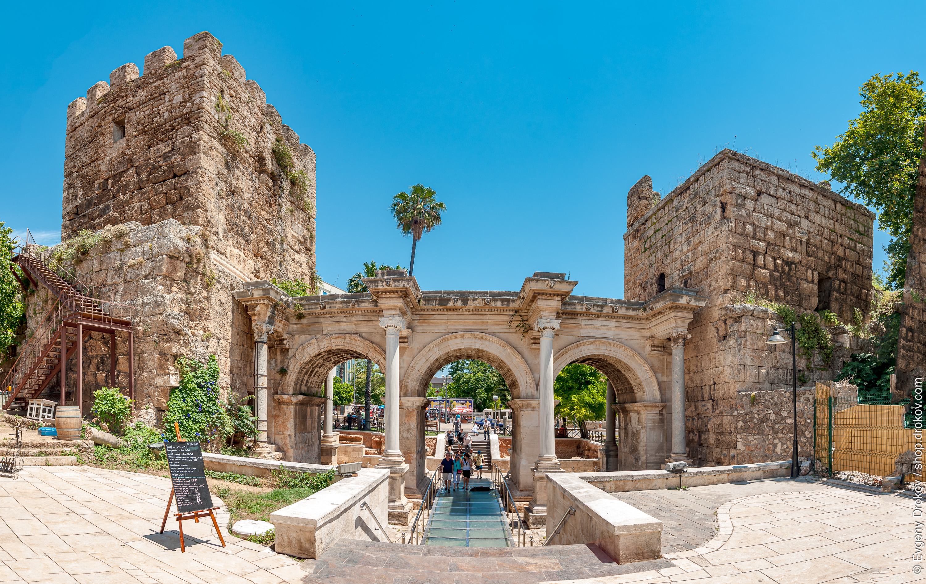 Ancient Roman arches and city walls stand tall in Antalya, Turkey. Tourists stroll through the historical site, enjoying the sunny day. The well-preserved architecture showcases the rich history of the region.