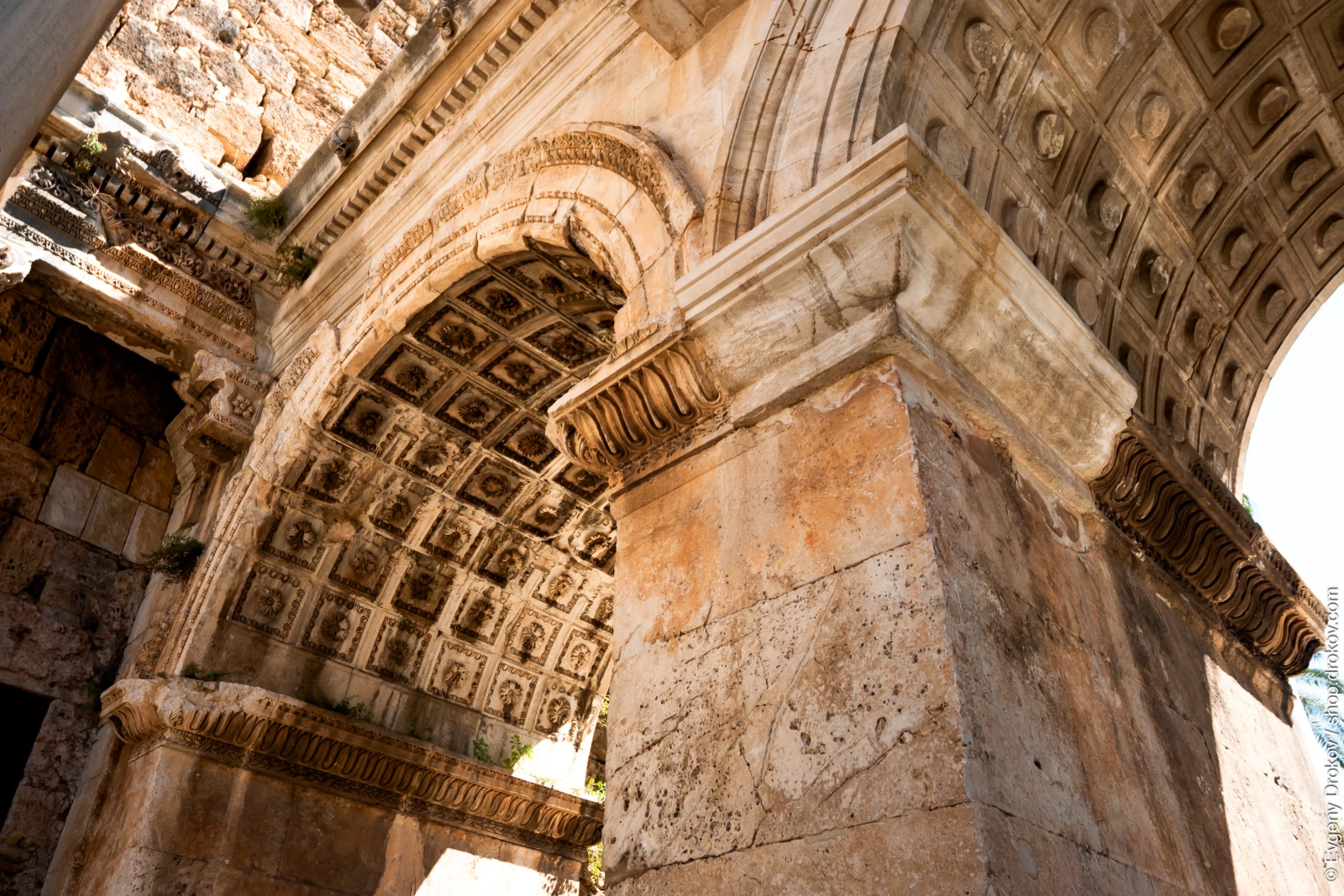 The ancient Hadrian's Gate in Antalya, Turkey, stands as a testament to Roman architecture. Captured in May, this detailed view highlights the intricate carvings and enduring stonework, inviting admiration for its historical significance and artistic craftsmanship.