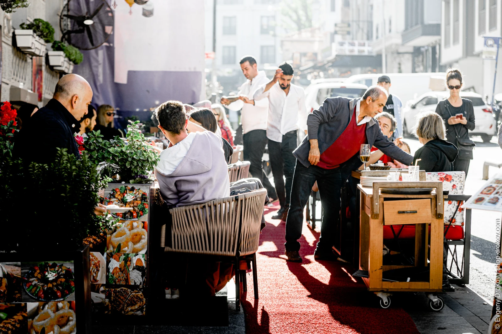 Diners enjoy a vibrant outdoor meal at a bustling Istanbul cafe. A waiter serves food, capturing the lively atmosphere of this Turkish culinary experience.