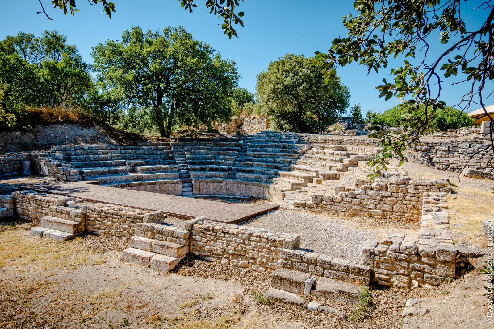 Ruins of an ancient amphitheater. The stones, clearly showing age, form tiered seating and a stage area. This is a historical site, showcasing a significant piece of the past.