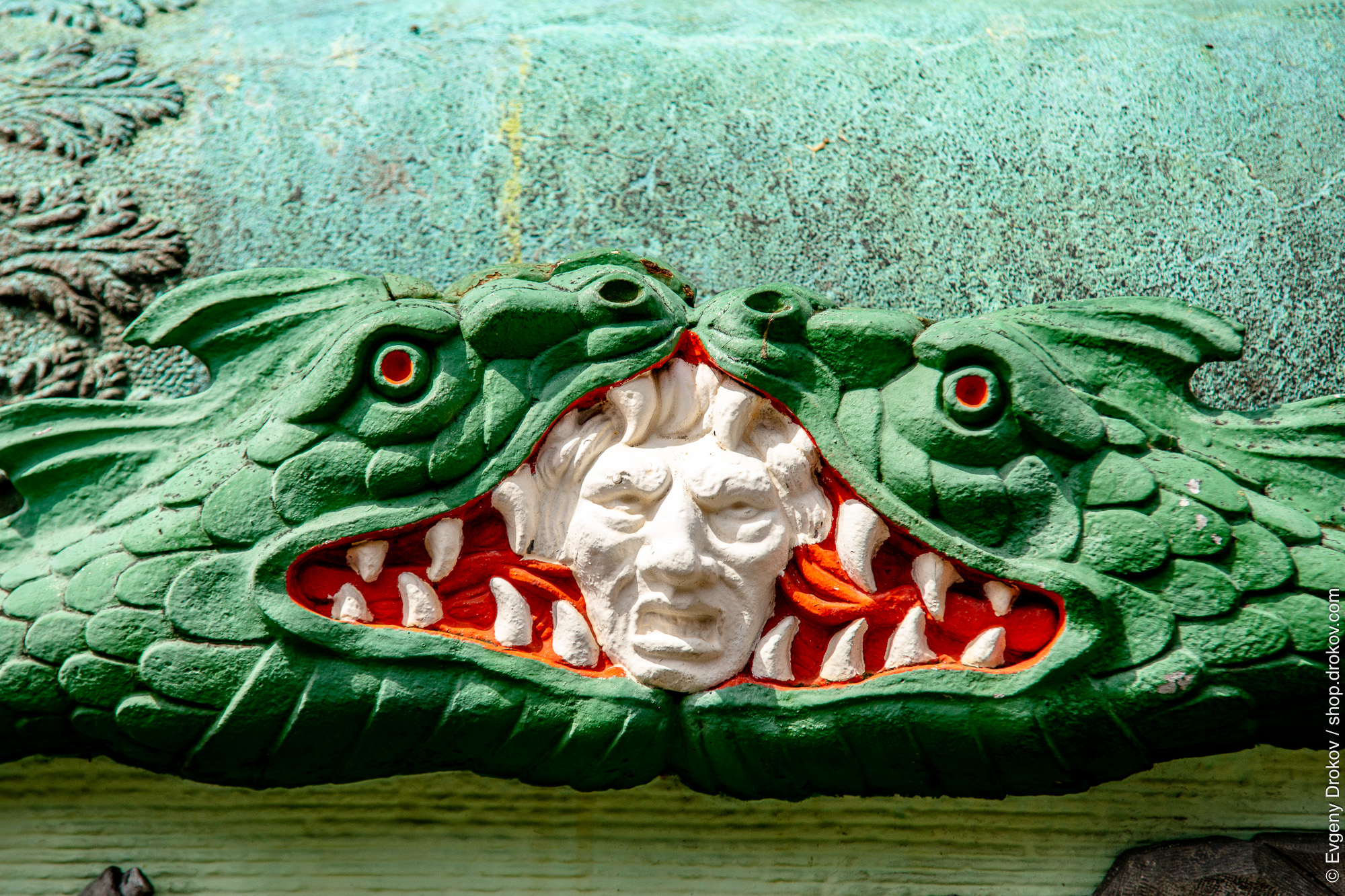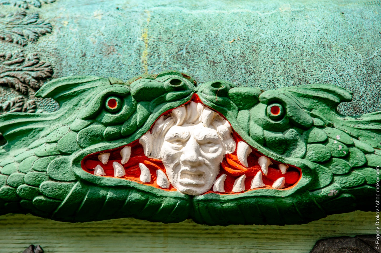 A detailed close-up reveals a fearsome dragon's head sculpture, a striking detail on a historical artifact at the Tower of London. This intricate artwork, captured during a summer day in London, United Kingdom, showcases the enduring craftsmanship and symbolic artistry of the landmark.