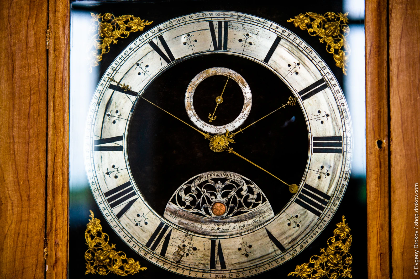 A detailed close-up of an antique astronomical clock face, featuring Roman numerals and intricate golden ornamentation, is presented. This artifact, located in Greenwich, London, United Kingdom, showcases the craftsmanship of its era, offering a glimpse into historical timekeeping and celestial observation.