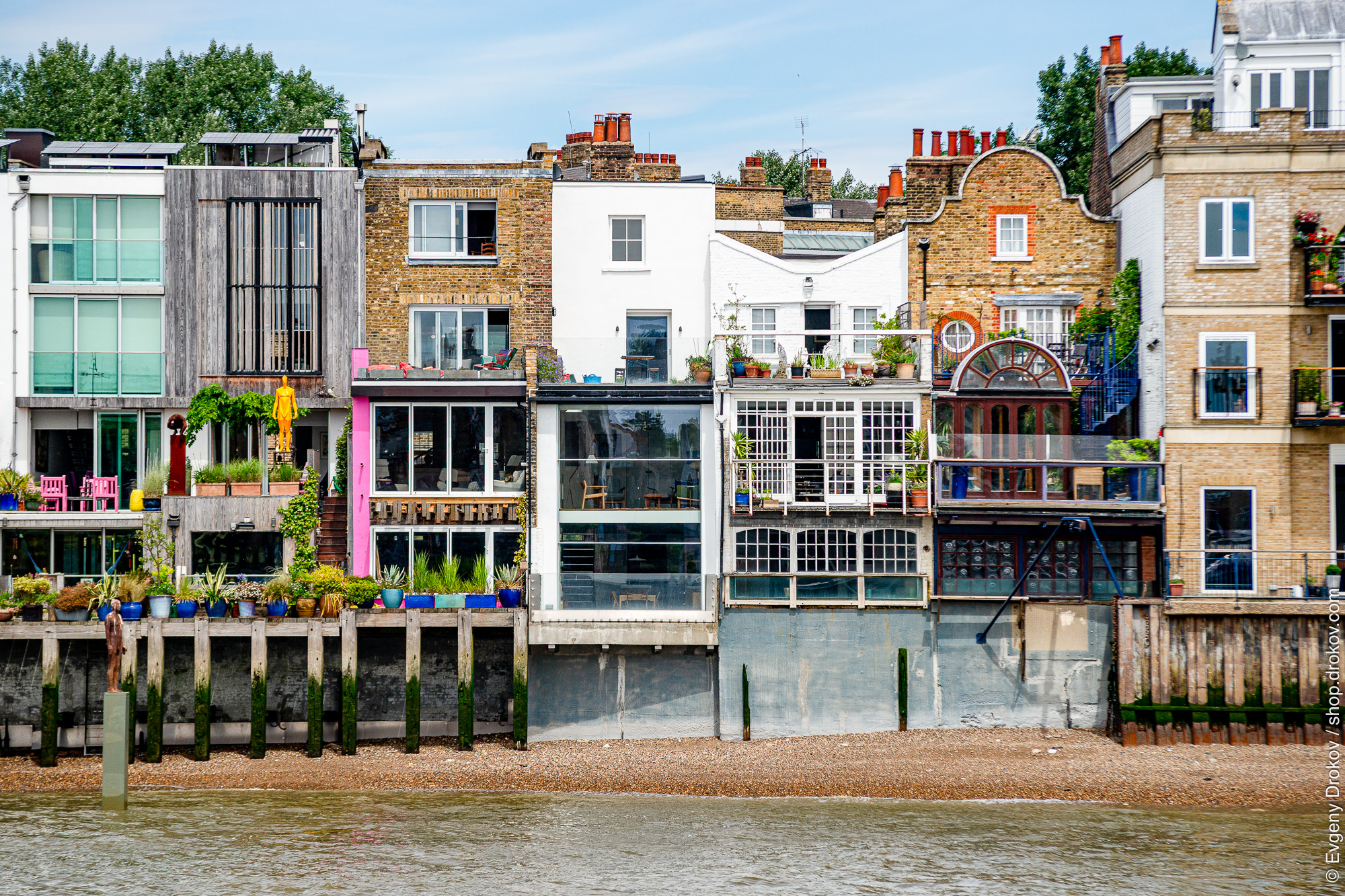 London's riverside is alive with eclectic architecture. This summer view captures the vibrant character of diverse homes lining the United Kingdom's waterfront, showcasing unique styles.