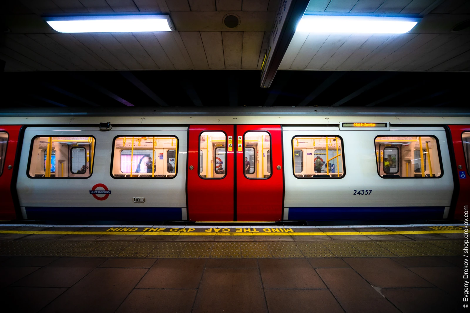 A London Underground train waits at a station platform during a summer evening. Commuters are visible inside the train, preparing for their journey. The iconic "Mind the Gap" warning is clearly displayed on the platform edge.
