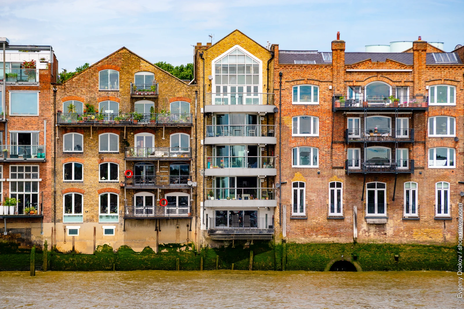 This is a view of riverside apartments in London during summer. The architecture showcases a blend of traditional brickwork and modern balconies, reflecting the city's dynamic urban landscape.