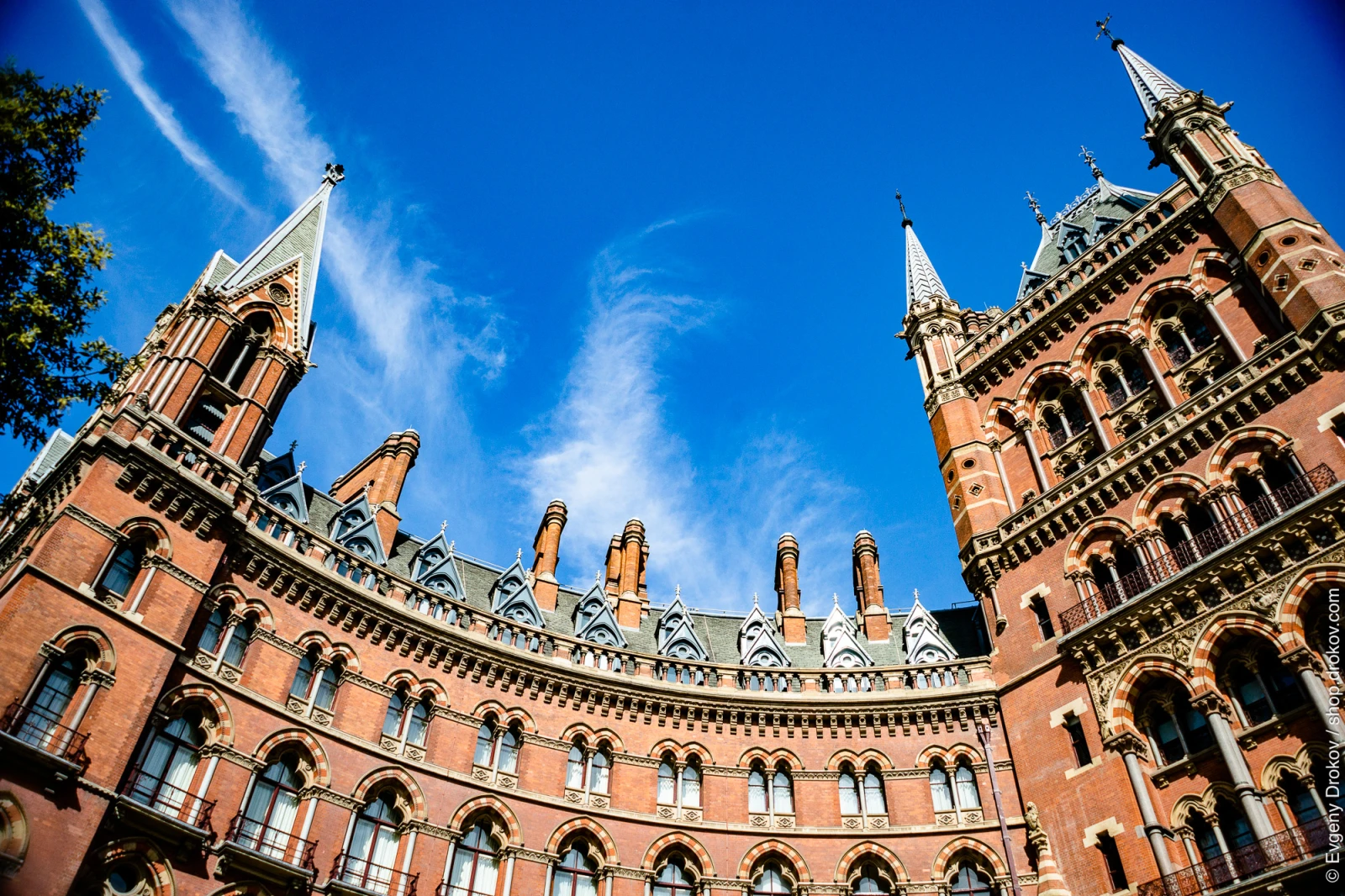 This is a striking architectural study of the Midland Grand Hotel in London, captured during a bright summer day. The grand Victorian building, with its distinctive red brick and ornate detailing, stands proudly against a vivid blue sky. The composition emphasizes the building's impressive scale and intricate design.