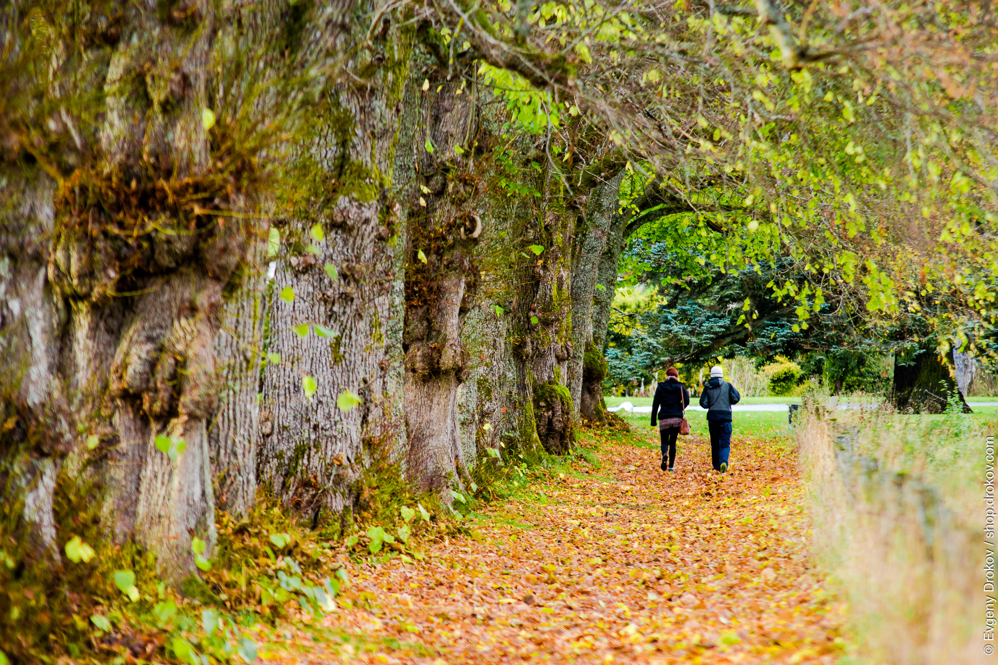 Two individuals walk along a leaf-strewn path in Scotland during November. The scene captures the essence of autumn's natural beauty in the highlands, with mature trees lining the way.