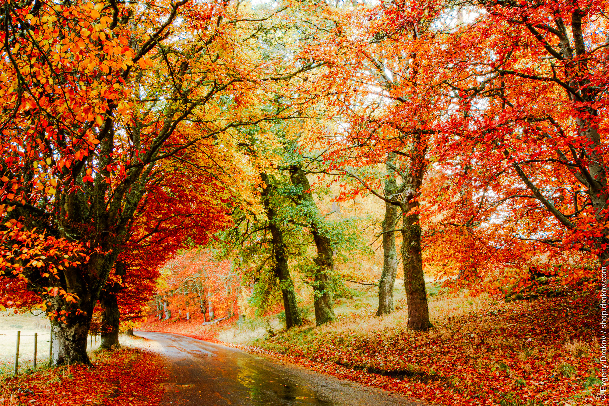 This is a vibrant autumn display of trees lining a wet road in Scotland. The rich reds, oranges, and yellows of the foliage capture the essence of the season. This artwork is available for purchase as a high-quality print.