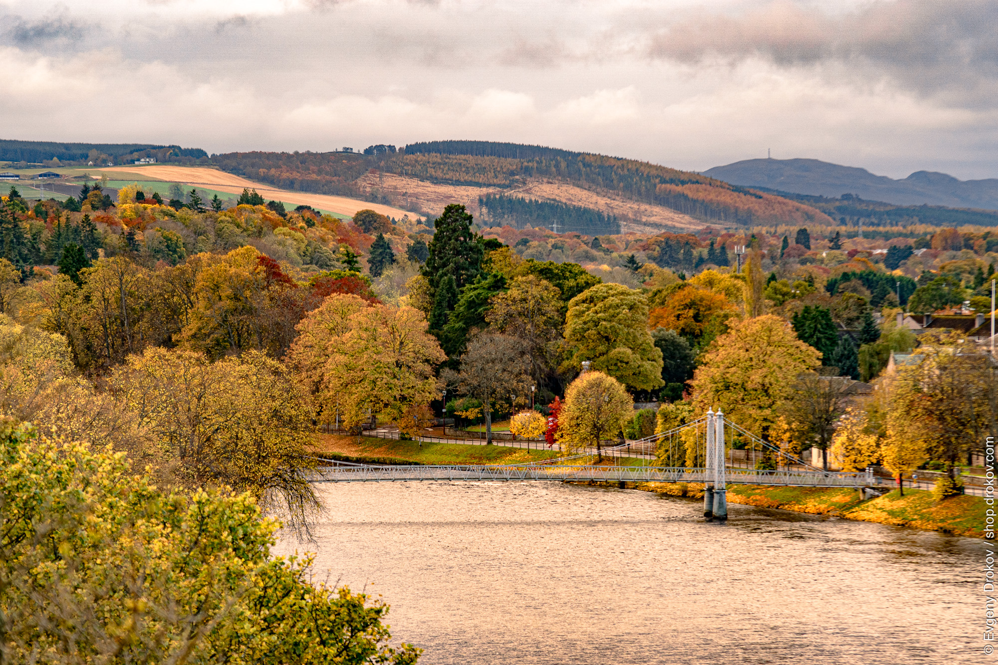 This vista captures the vibrant autumn foliage of Inverness, Scotland. The Highlands' rolling hills and lush meadows are ablaze with color, framing a serene river crossed by a picturesque bridge. This artwork is presented to showcase the natural beauty of the region.
