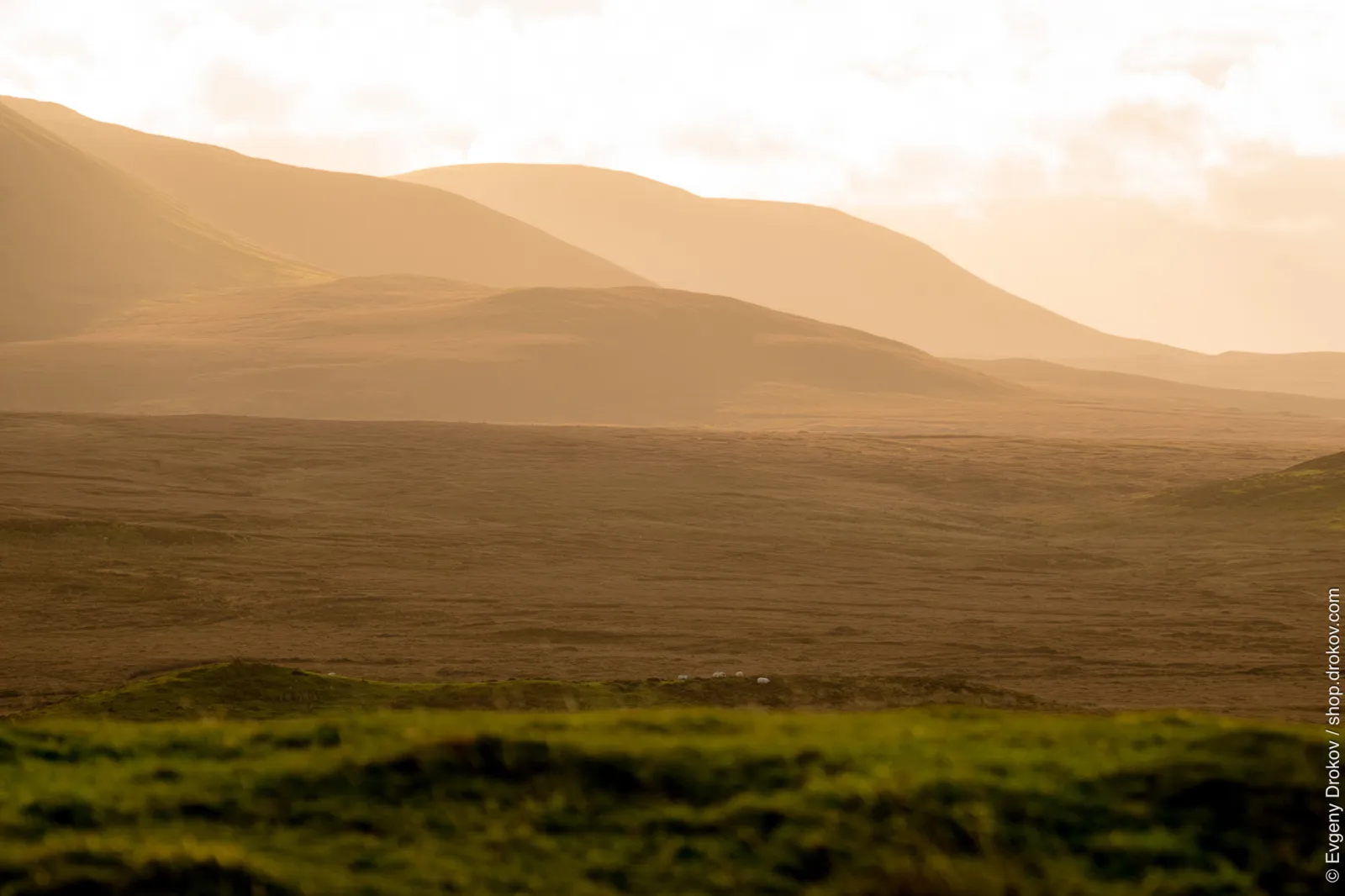 A flock of sheep grazes on a windswept meadow in the Scottish Highlands during a soft November sunset. The warm, golden light bathes the rolling hills, creating a serene and timeless atmosphere. This capture highlights the raw beauty and tranquility of Scotland's natural landscape.