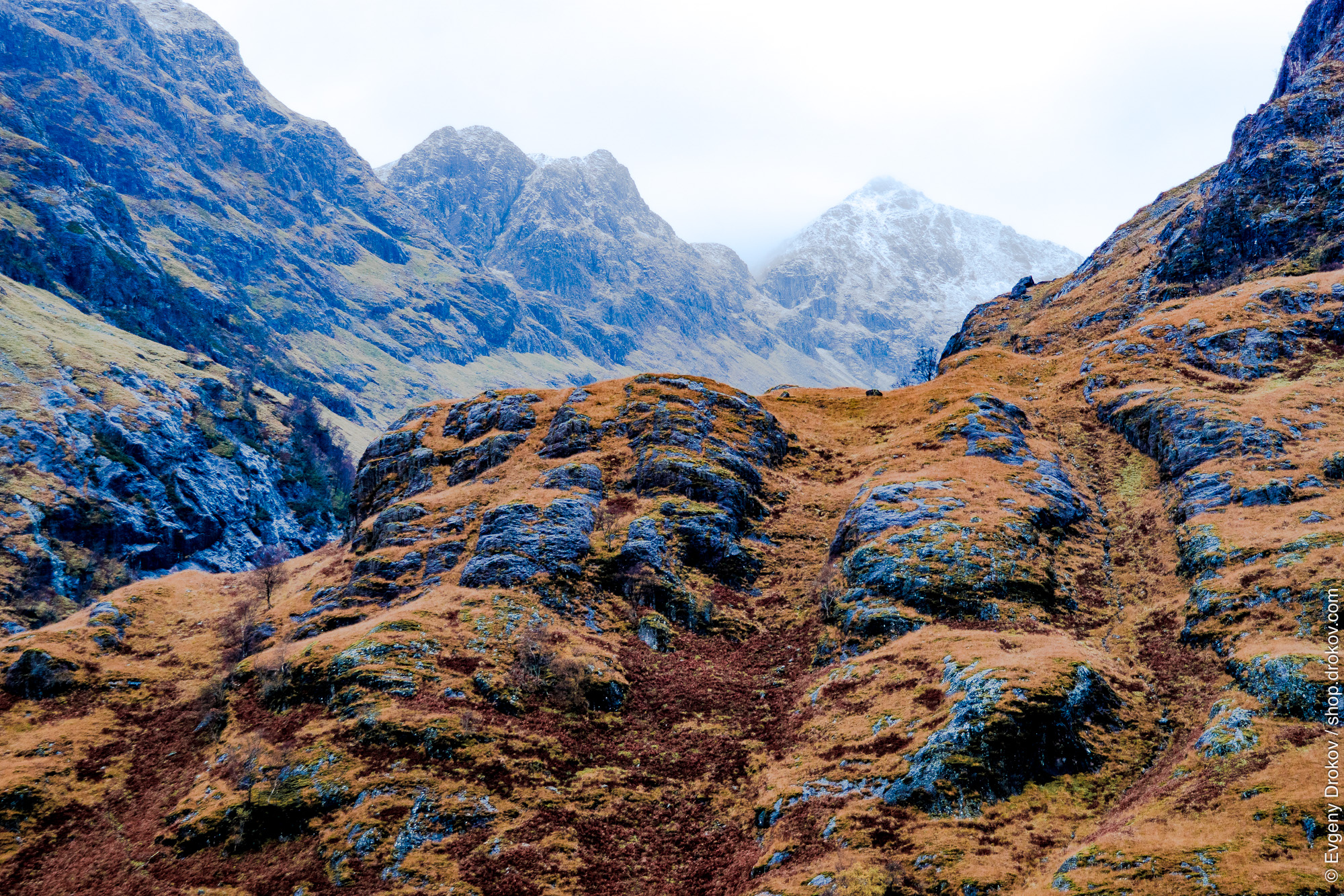 Dramatic Scottish Highlands in November. The rugged terrain, a tapestry of autumnal hues and rocky outcrops, showcases the raw beauty of the United Kingdom's natural landscape. This vista captures the essence of Scotland's wild heart.