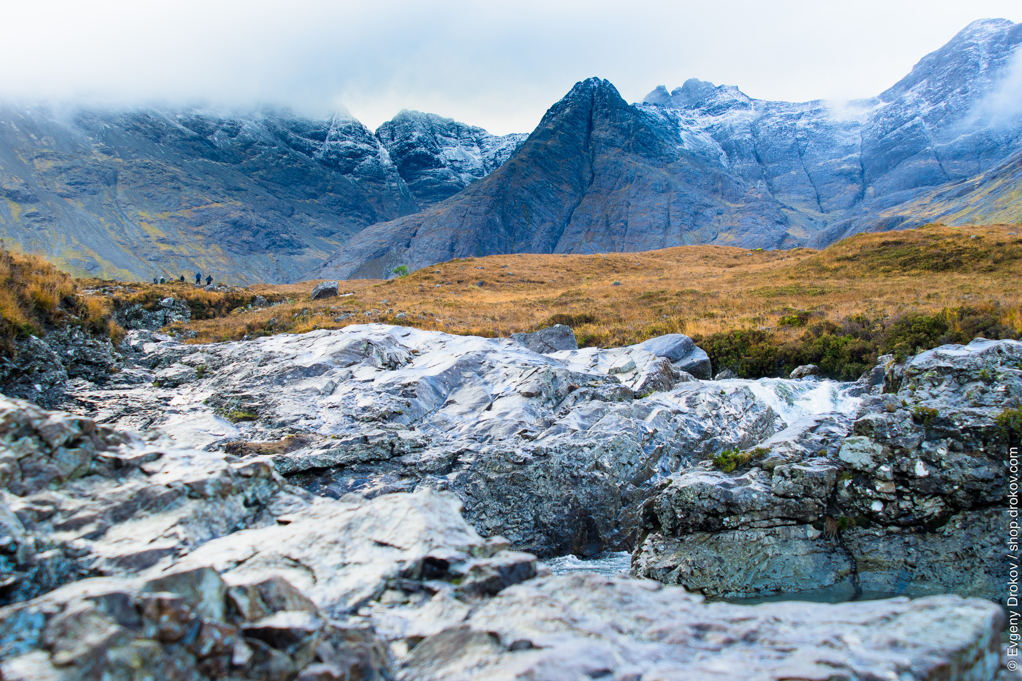 A group of hikers traverse the rugged terrain of Scotland's Highlands in November. The dramatic mountain peaks, dusted with early snow, rise above golden meadows and a rocky riverbed, showcasing the raw, untamed beauty of the Scottish landscape.