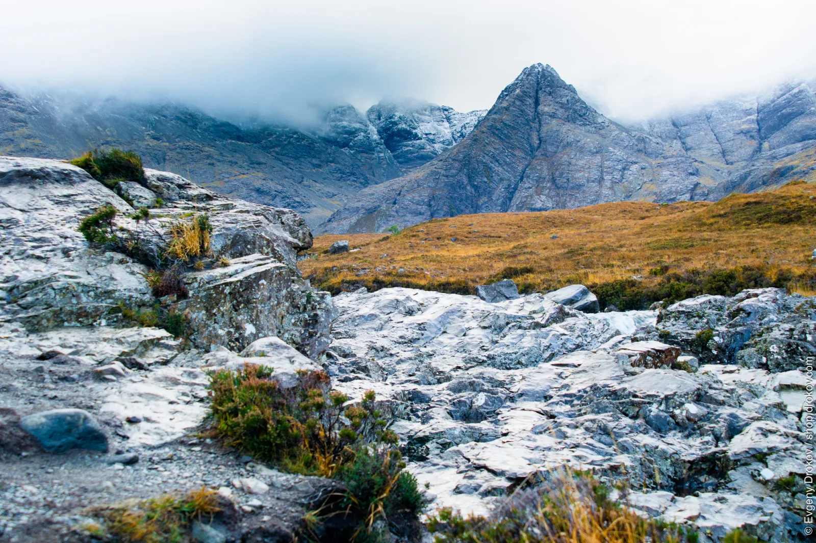 This is a dramatic mountain vista in Scotland, captured in November. The rugged peaks, shrouded in mist, meet a landscape of rocky terrain and autumnal meadows. This composition showcases the raw, untamed beauty of the Scottish Highlands.