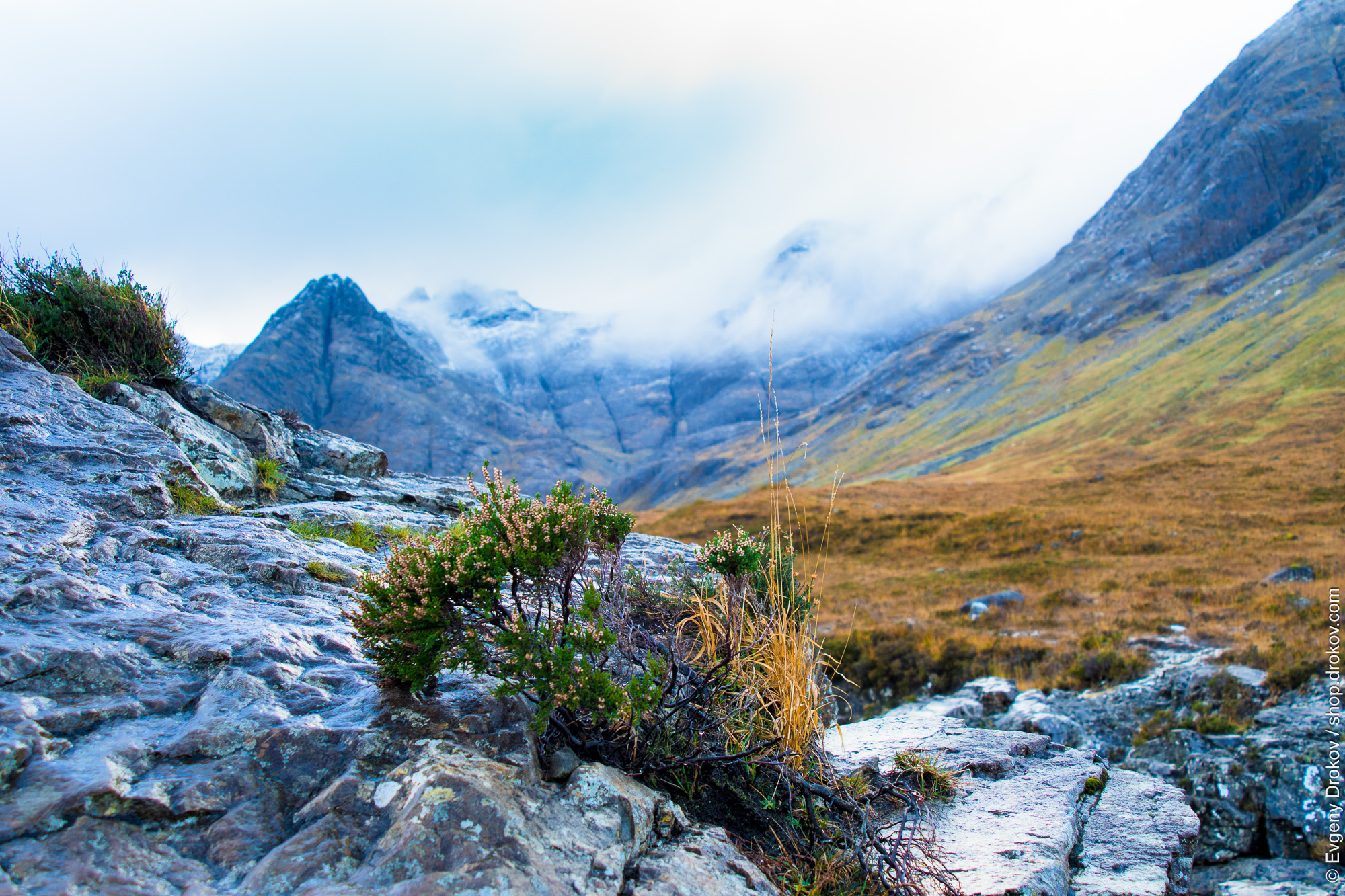 This is a close-up of rugged, rocky terrain in Scotland, with a small heather plant in the foreground. In the background, mist-shrouded mountains rise, showcasing the dramatic beauty of the Scottish Highlands in November. The composition emphasizes the raw, untamed nature of the landscape.