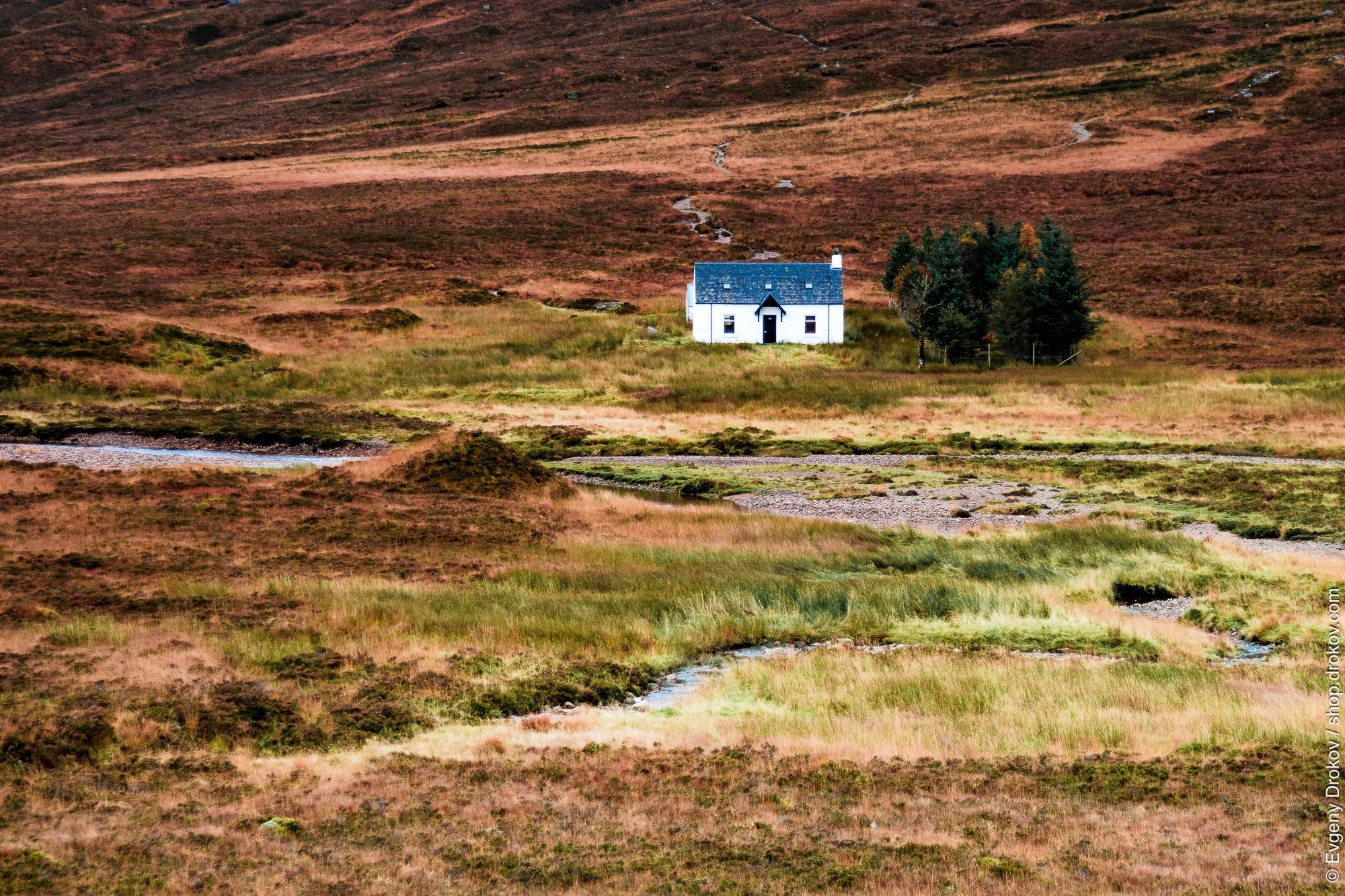 A solitary white cottage stands against the rugged, autumnal landscape of the Scottish Highlands. This composition captures the essence of remote living and the stark beauty of nature in November.
