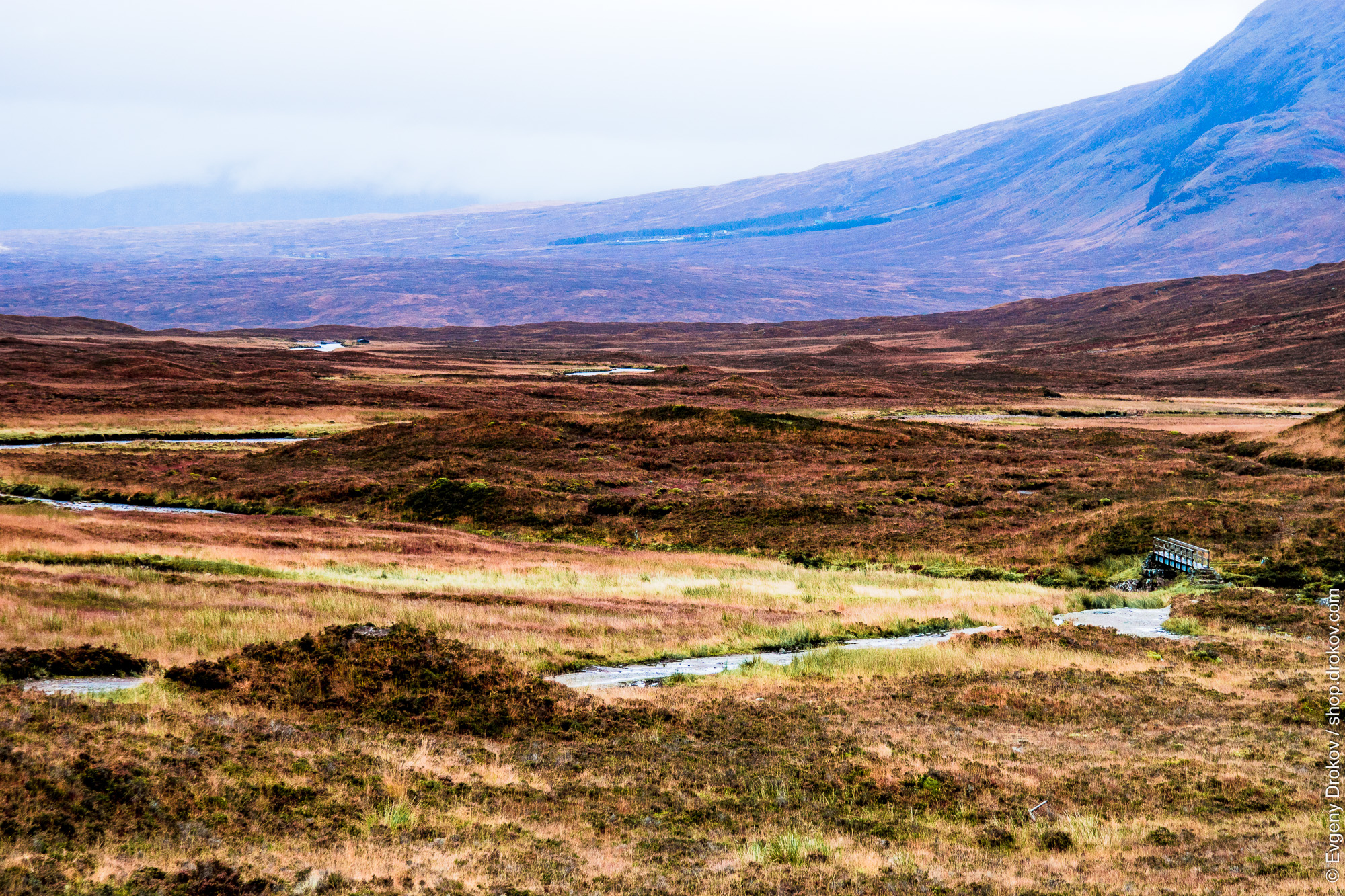 A lone bridge crosses a meandering stream through the rugged, heather-covered highlands of Scotland in November. This vista captures the raw, untamed beauty of the Scottish landscape, inviting contemplation of its enduring wilderness.