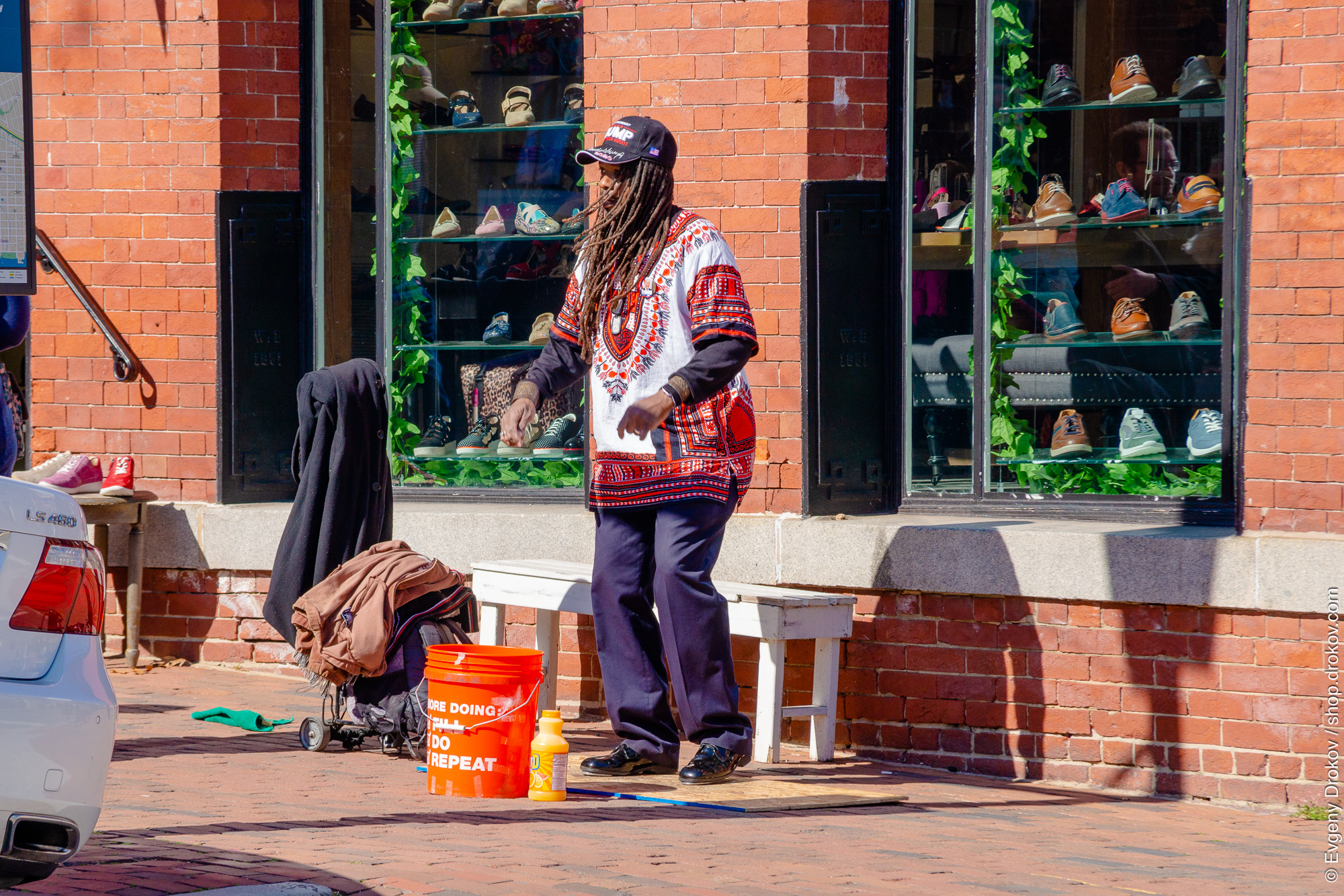 A man performs a tap dance routine on a wooden plank in Old Town Alexandria, Virginia. He is dressed in a vibrant, patterned shirt and dark pants, with a "Trump" baseball cap. His performance is set against the backdrop of a brick building with a shoe store display.