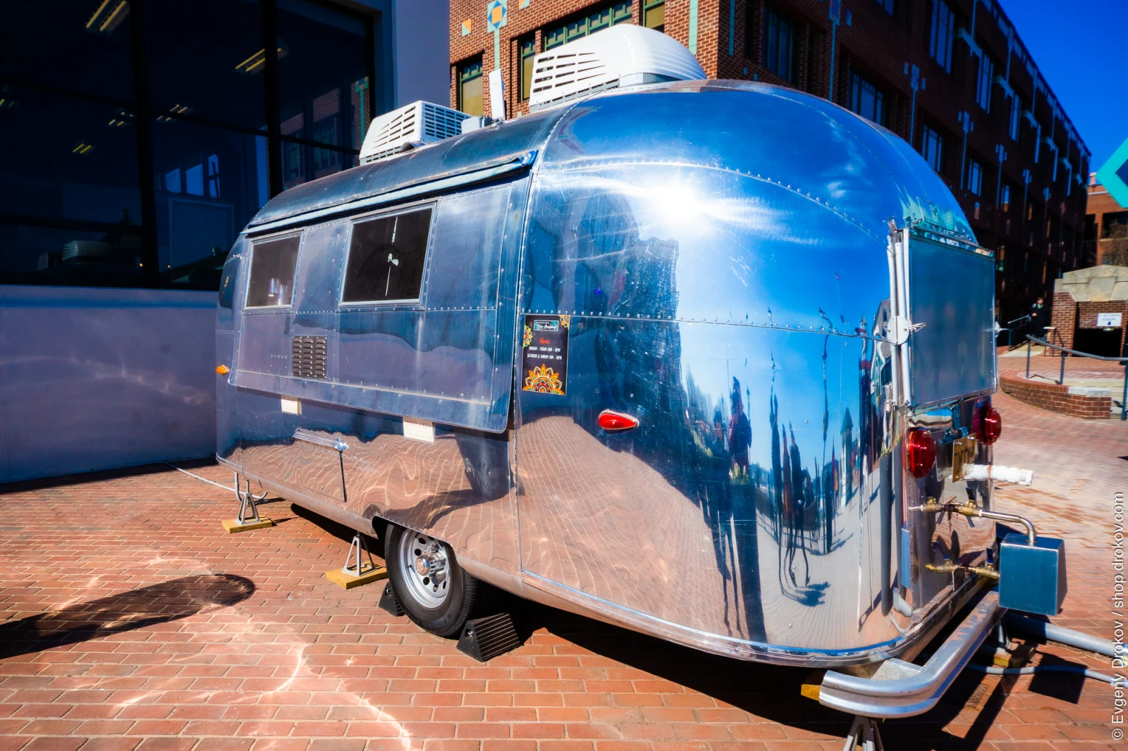 A gleaming Airstream trailer is parked on a brick patio in Old Town Alexandria, Virginia. This iconic vehicle, a symbol of adventure and retro style, is positioned for service, ready to offer its unique charm and offerings to passersby.