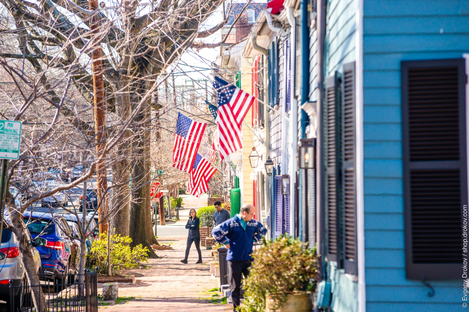 American flags adorn the historic streets of Old Town Alexandria, Virginia, showcasing patriotic pride. Residents and visitors stroll along the brick sidewalks, enjoying the charming architecture and vibrant atmosphere of this beloved American city.