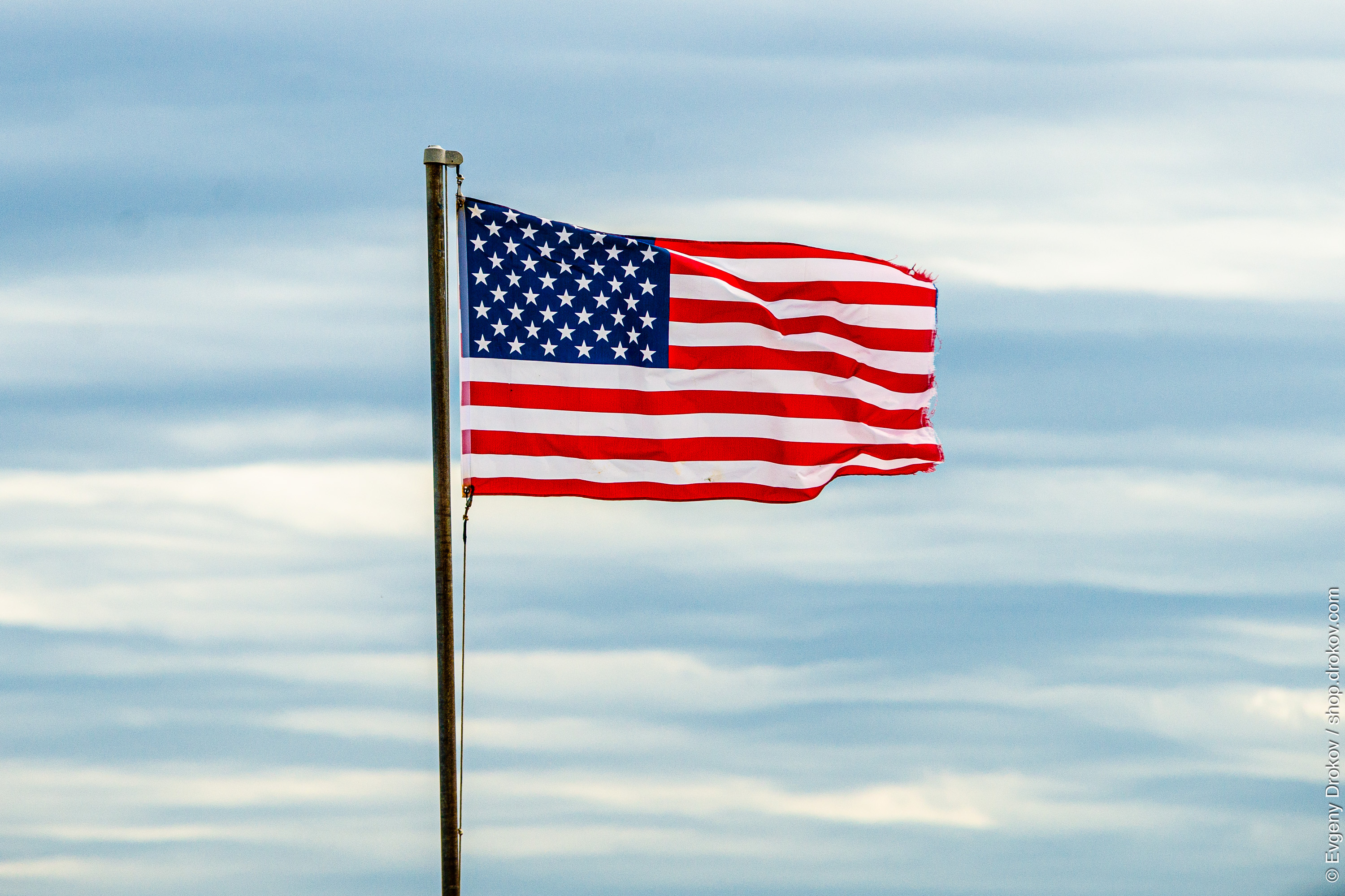 The American flag flies proudly against a cloudy sky in Flagler Beach, Florida. This capture embodies patriotism and the enduring spirit of the United States.