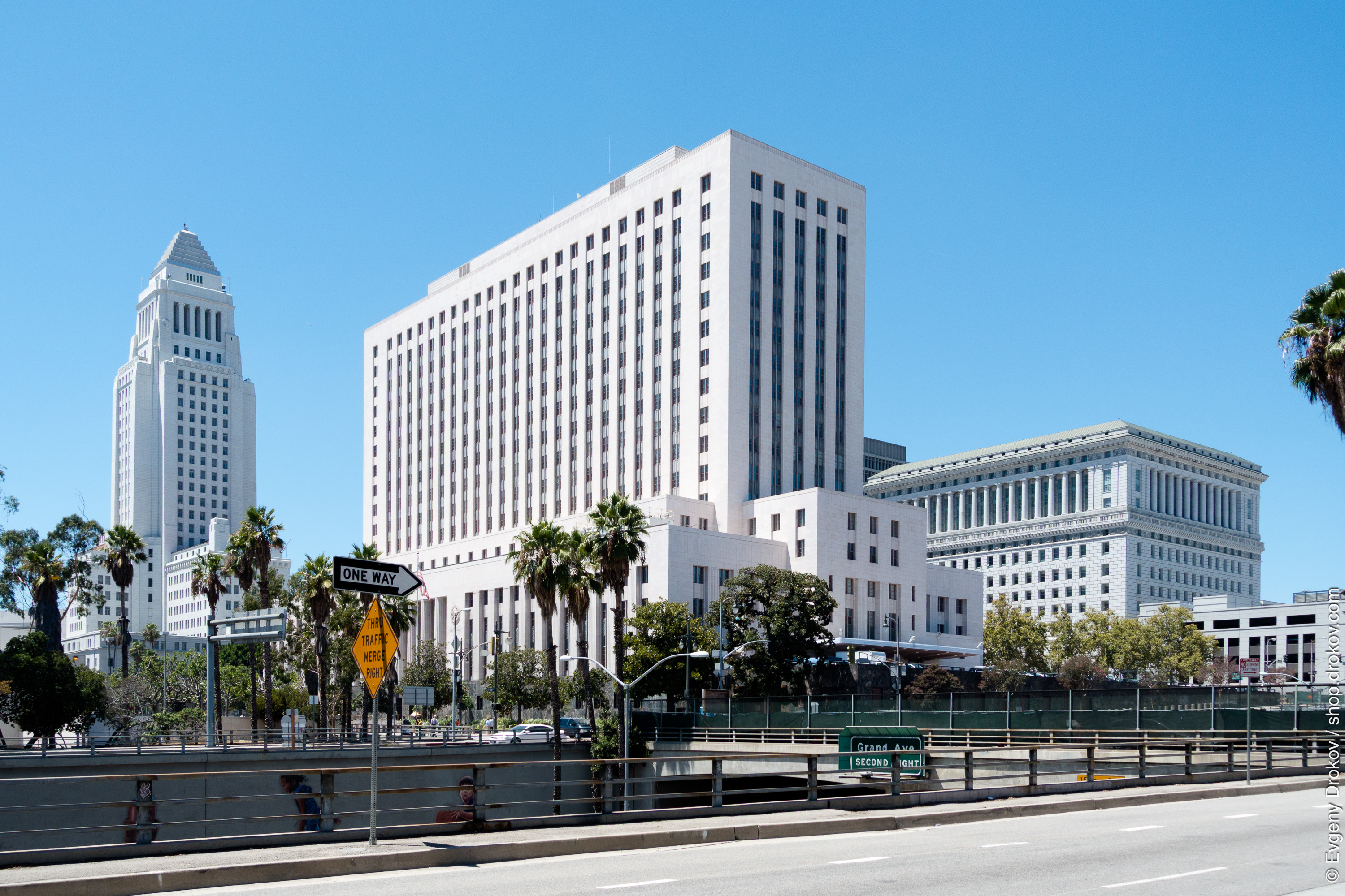 This architectural composition captures the grandeur of Los Angeles City Hall and surrounding civic buildings under a clear August sky in 2014. The precise lines and imposing structures convey a sense of order and governmental authority.