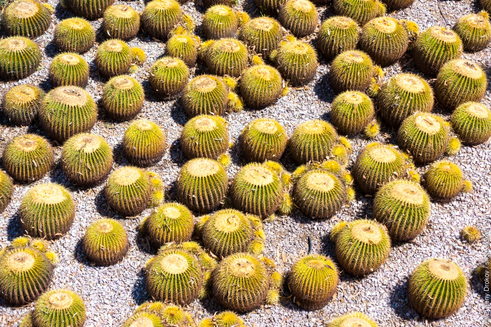 Golden Barrel Cacti thrive in the arid landscape of the Getty Center, Los Angeles, California, USA, in August 2014. This collection showcases the resilience and unique beauty of these desert plants, thriving under the bright California sun.
