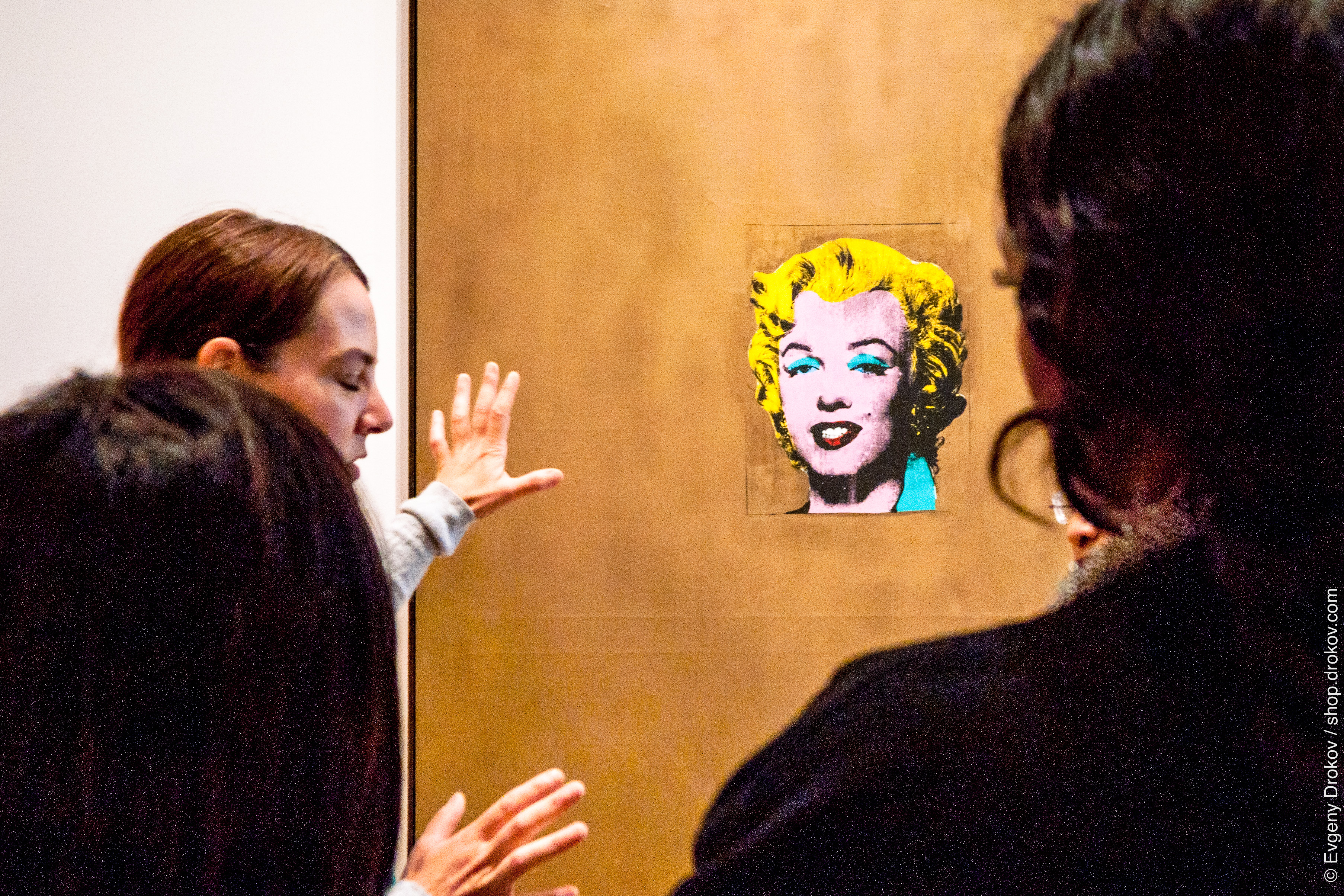 Visitors engage with Andy Warhol's iconic Marilyn Diptych at MoMA in New York City. This artwork, a cornerstone of Pop Art, explores themes of celebrity, mass production, and mortality.