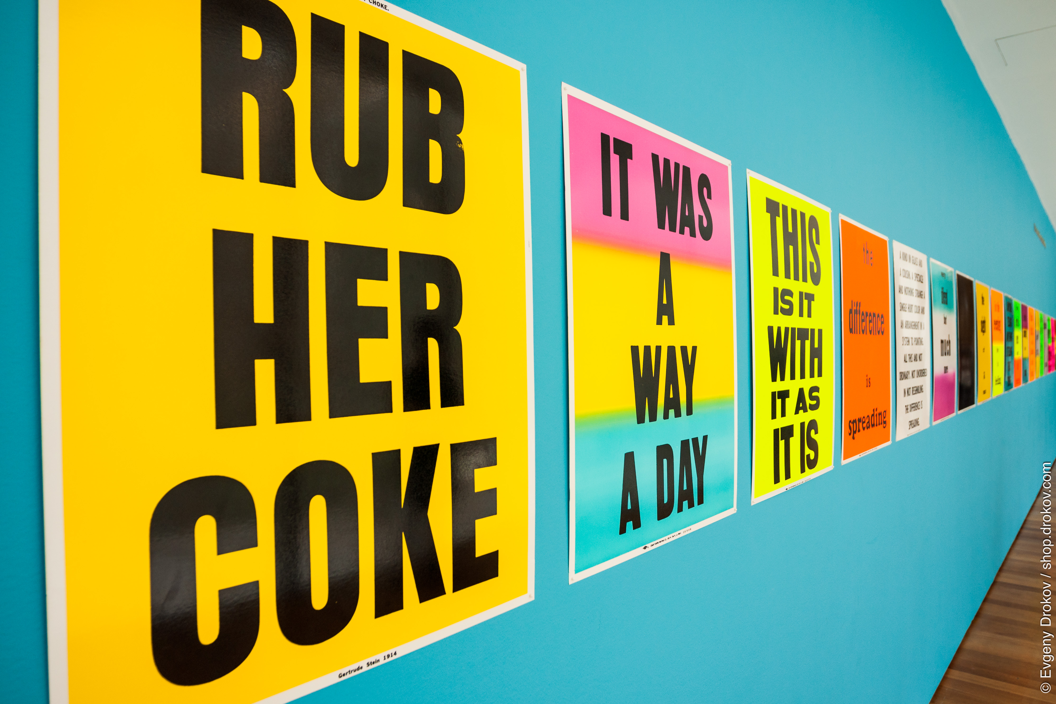 Bold typographic posters, featuring phrases like "RUB HER COKE" and "IT WAS A WAY A DAY," are displayed at MoMA in New York City. This exhibition showcases the power of text and color in modern art.