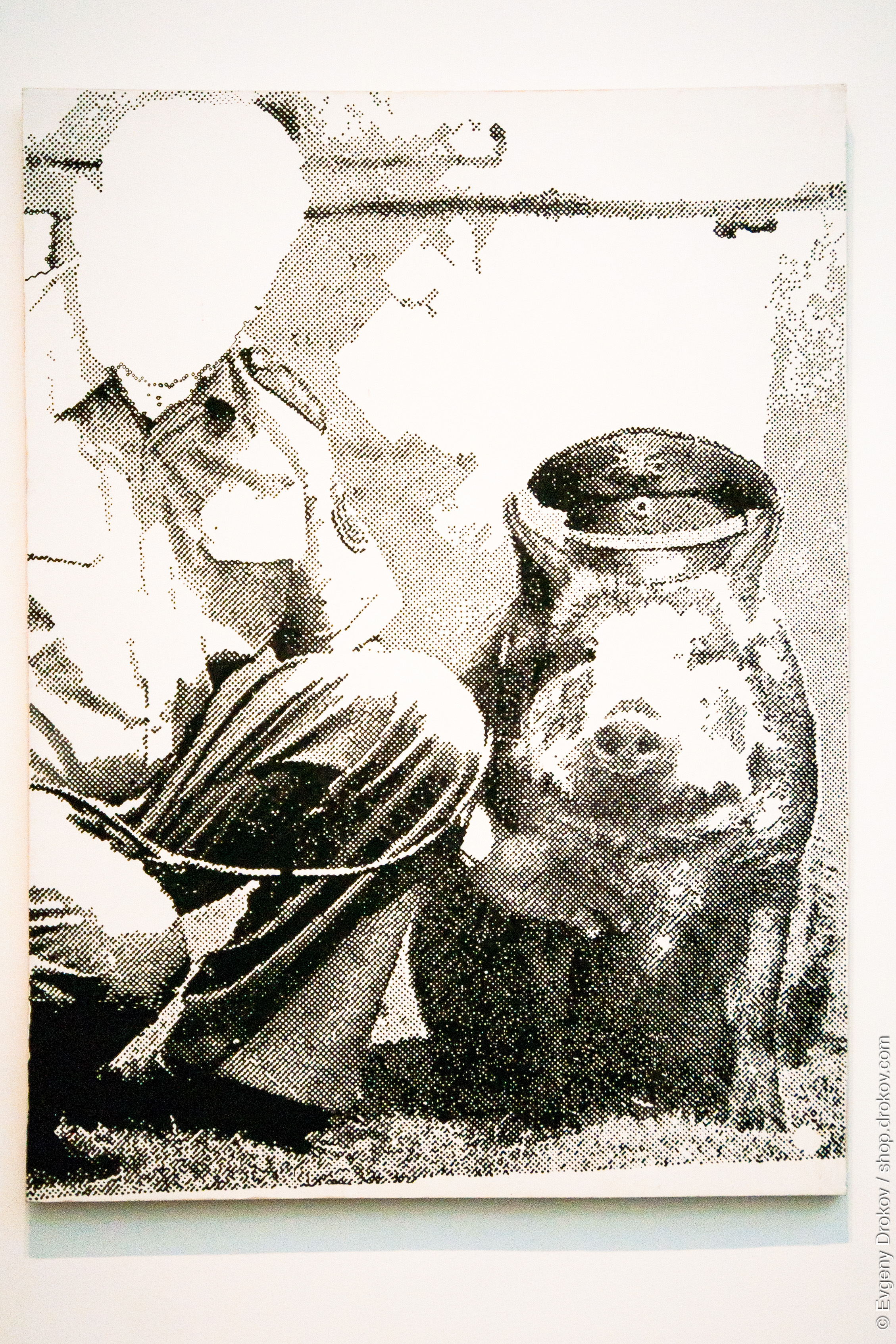 This artwork, displayed at MoMA in New York, USA, depicts a figure in military attire interacting with a large, patterned vessel. The artist's intent is to explore themes of identity and societal roles through this striking visual composition.