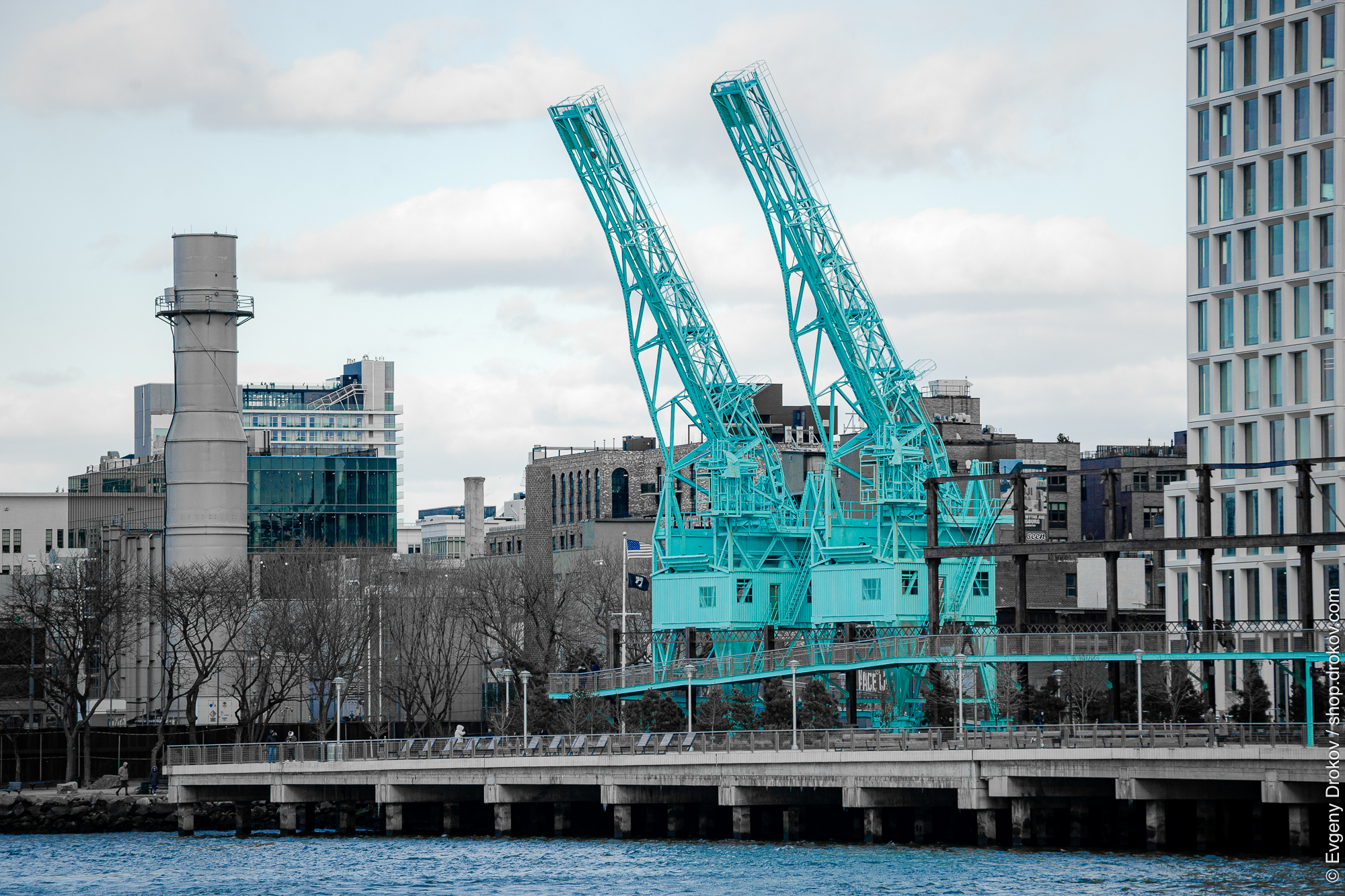Two iconic teal-colored cranes stand tall against a cloudy sky, symbolizing industrial heritage and urban development. Their presence highlights the transformation of the waterfront, blending historical structures with modern architecture.