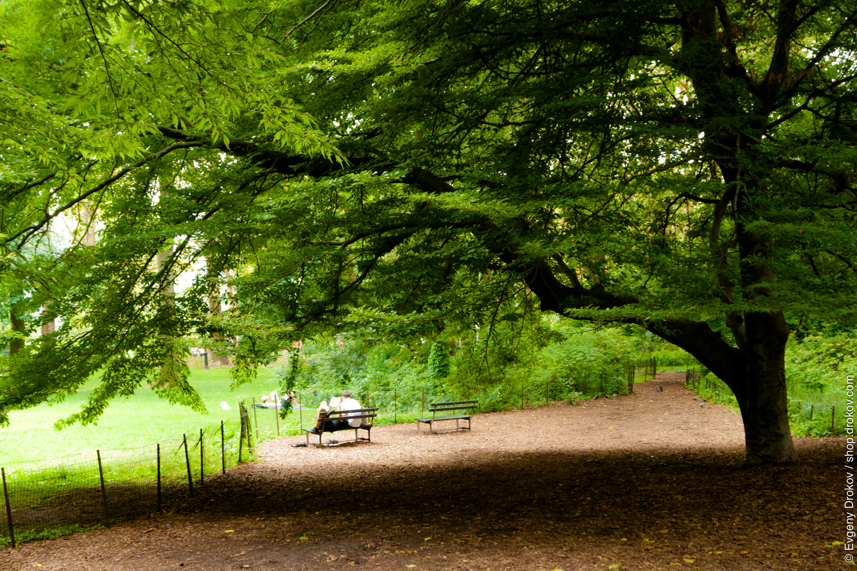 A man reads a book on a bench in Central Park, New York City, on a bright August day in 2014. He seeks quiet contemplation amidst the lush greenery.