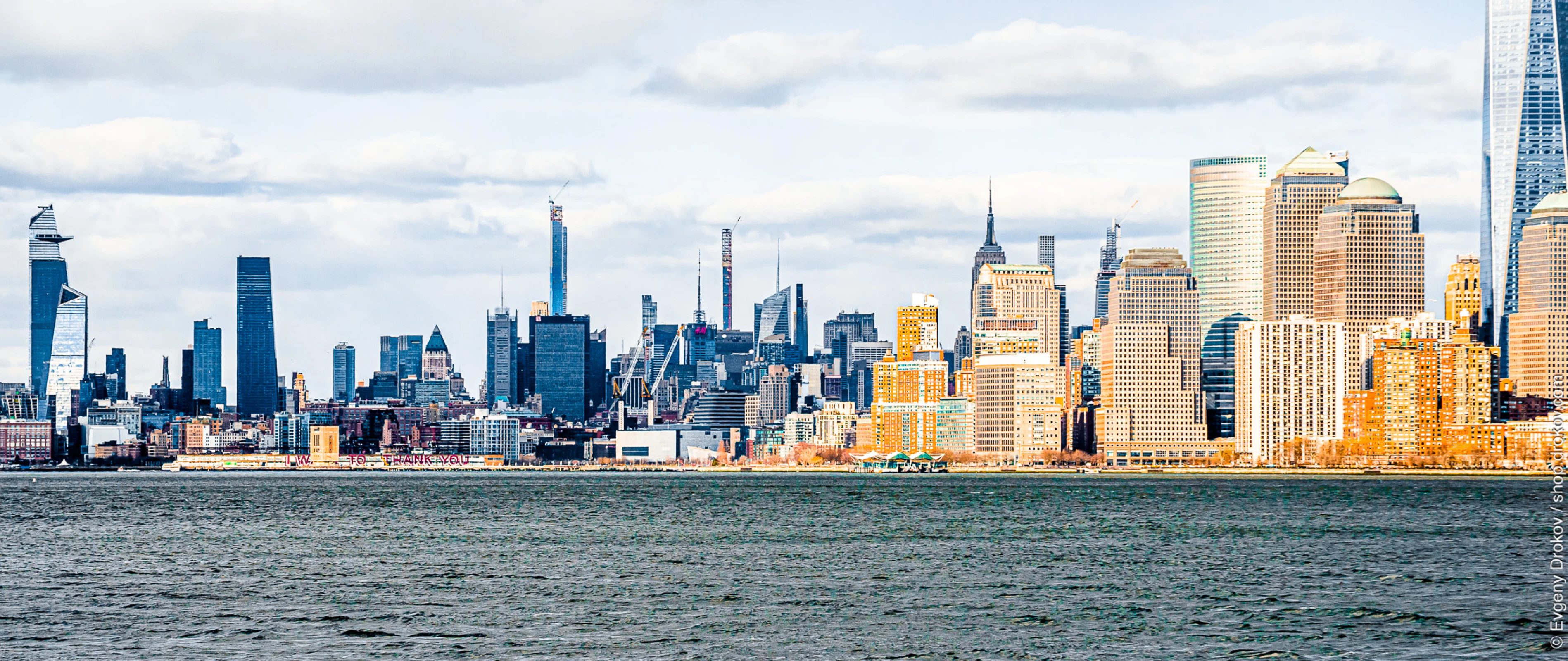 Manhattan's iconic skyline stands tall against a cloudy February sky in 2020. This expansive view captures the city's architectural grandeur, showcasing a dynamic blend of historic and modern structures.