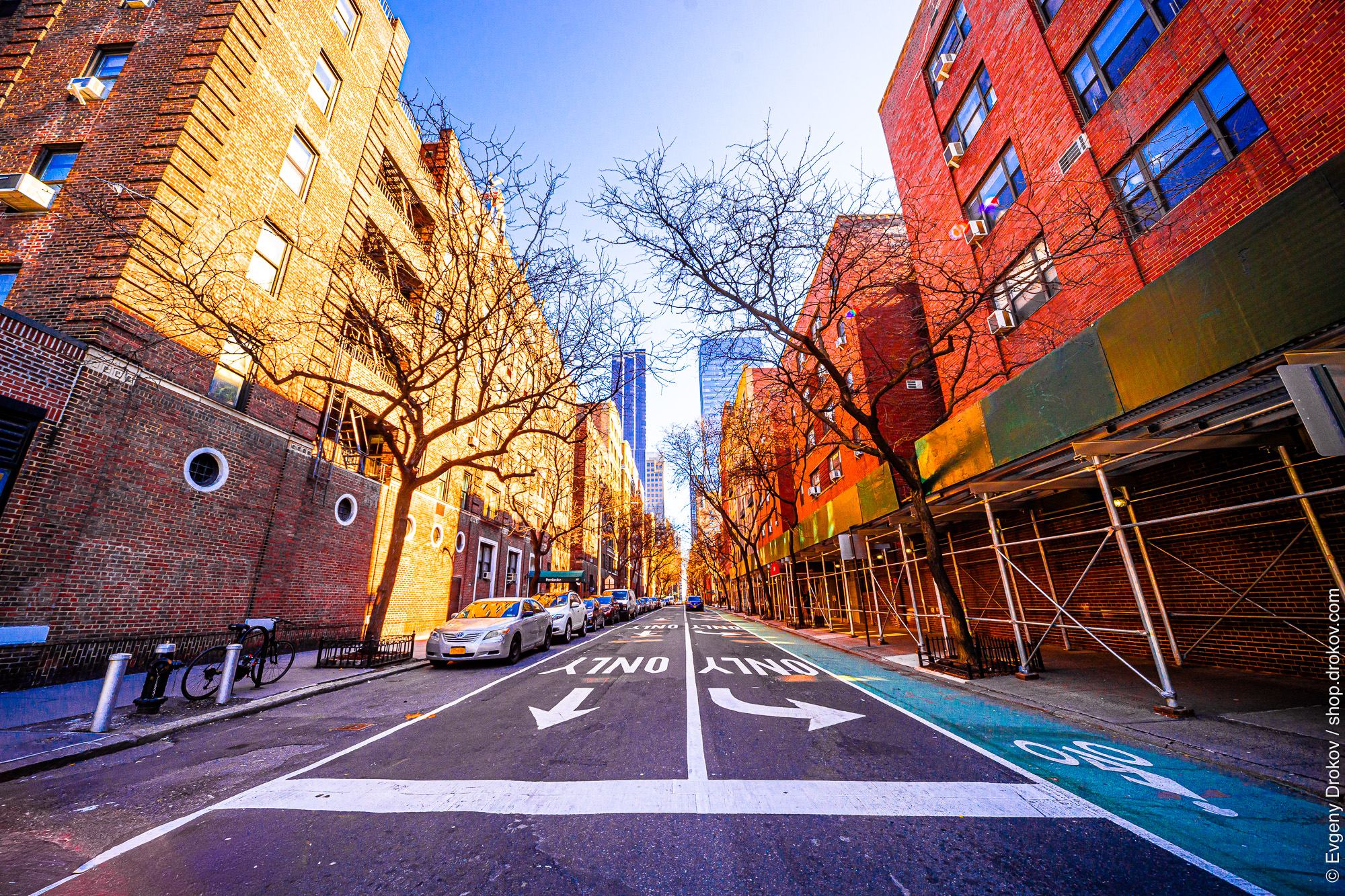 Manhattan, New York, February 2020. A street in Manhattan captures the urban landscape with brick buildings, parked cars, and a dedicated bike lane. The composition highlights the city's infrastructure and daily life.