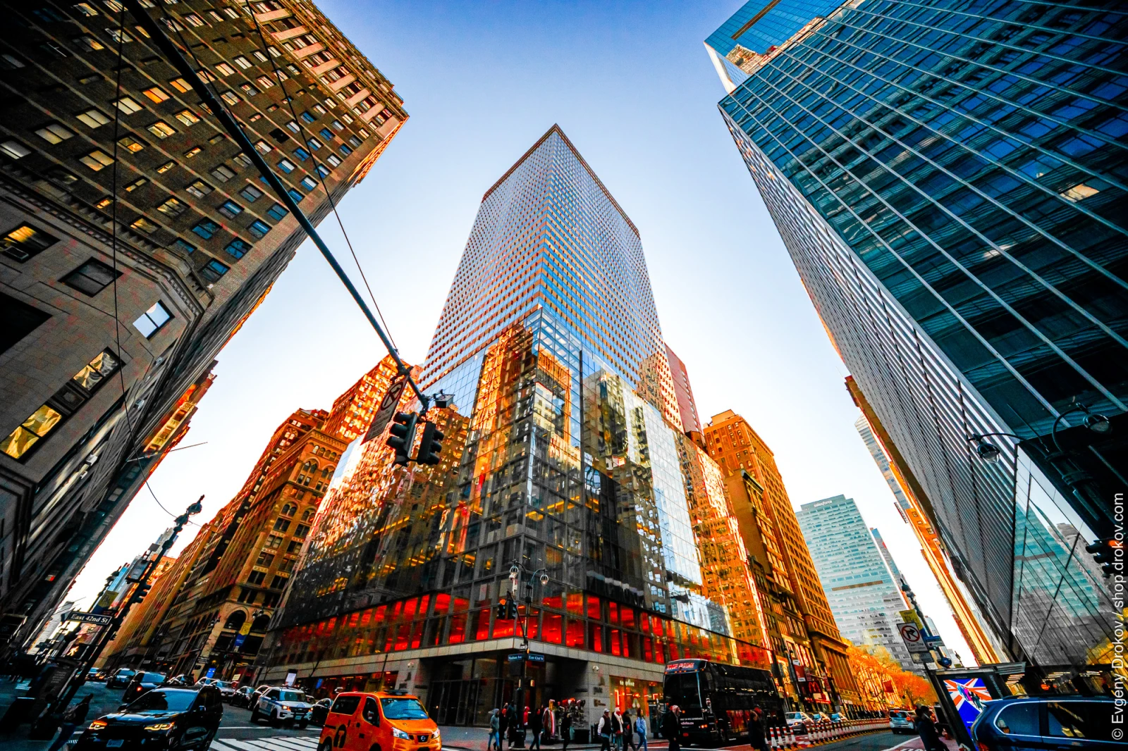Manhattan, New York City, February 2020. The vibrant energy of Midtown is captured as the setting sun casts a warm glow on the iconic skyscrapers. This dynamic urban landscape showcases the architectural grandeur and bustling street life of one of the world's most famous cities.
