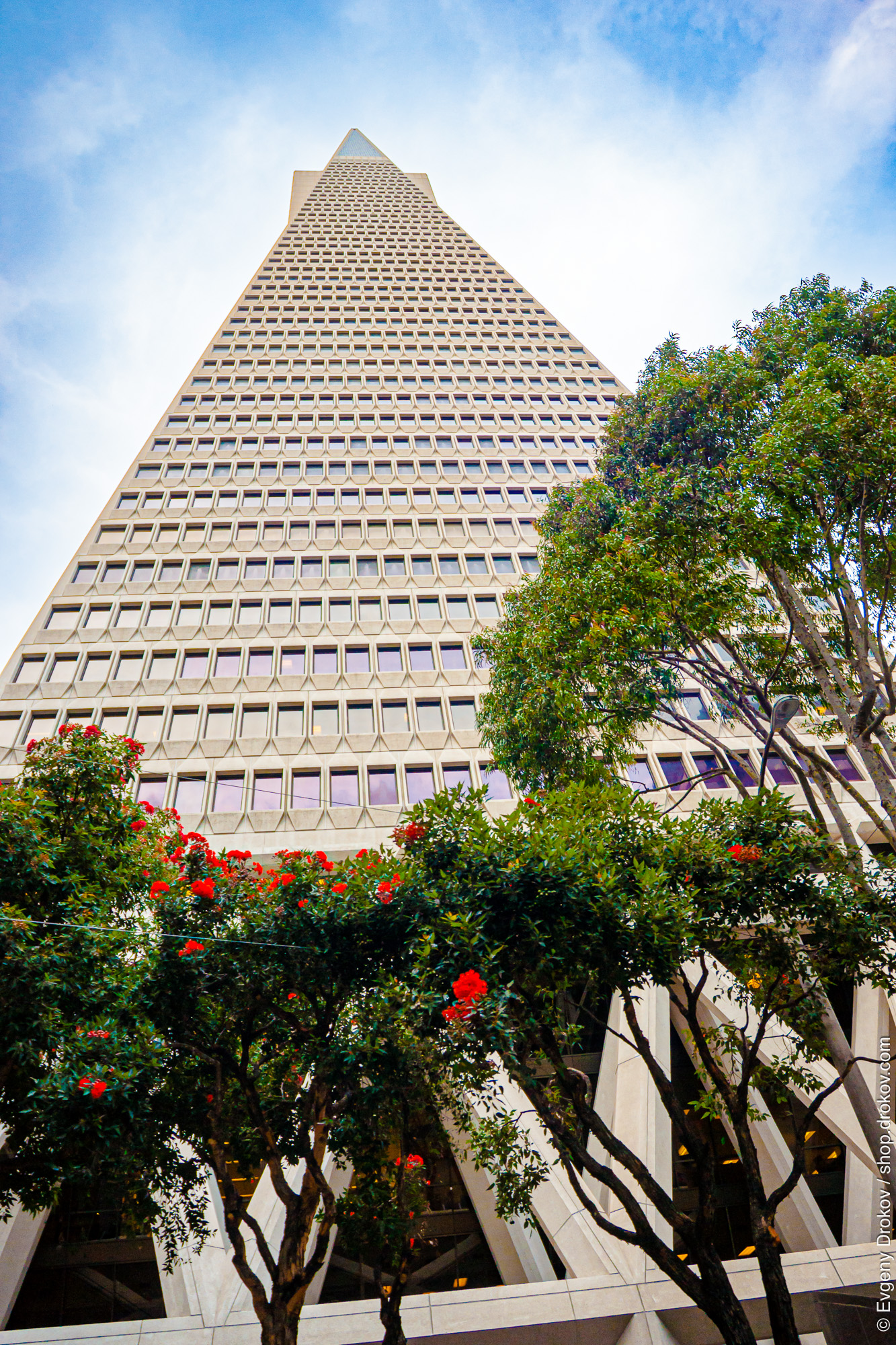 In August 2014, the iconic Transamerica Pyramid in San Francisco, California, stands tall against a bright sky. Lush trees with vibrant red blossoms frame the base of the pyramid, showcasing a striking contrast between urban architecture and natural beauty. This composition captures the essence of San Francisco's unique cityscape.
