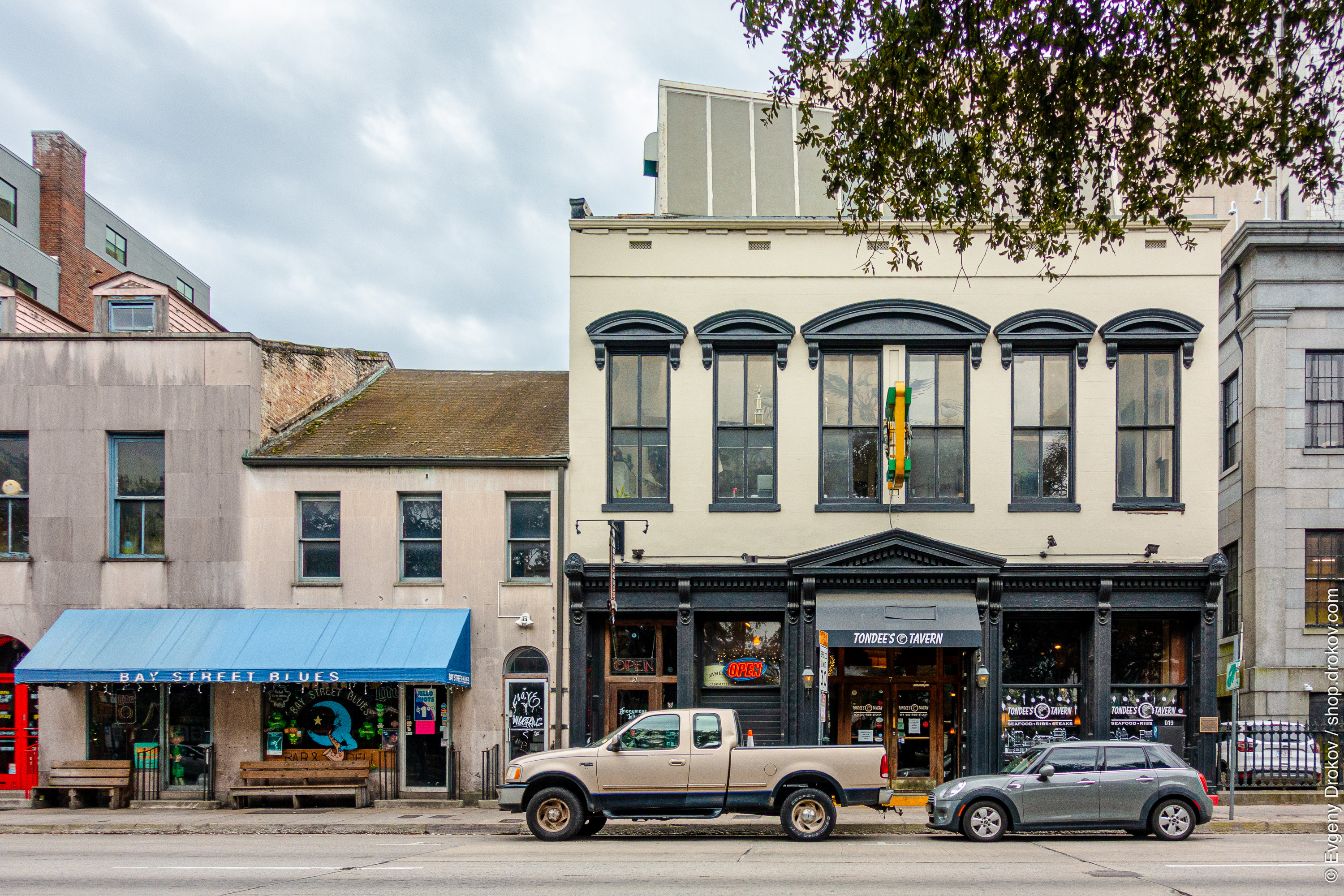A beige pickup truck and a gray Mini Cooper are parked on a street in Savannah, Georgia, USA. The vehicles are positioned in front of businesses, including "Bay Street Blues" and "Tondee's Tavern," showcasing the vibrant commercial district.