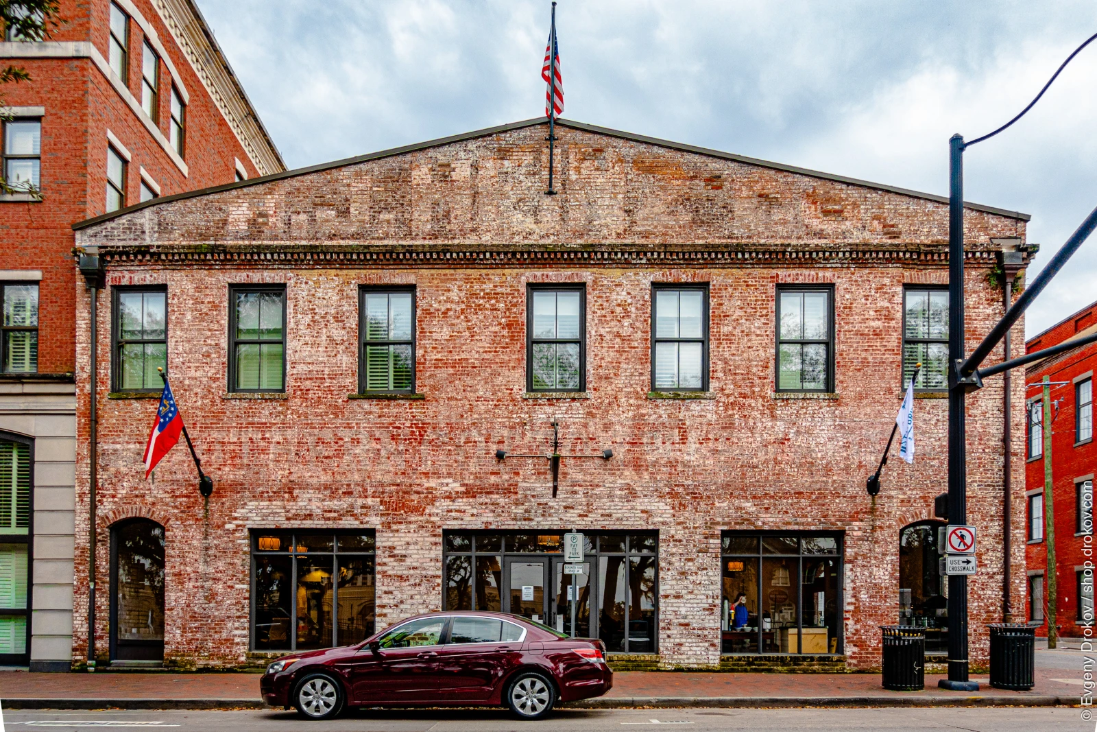 A brick building in Savannah, Georgia, USA, stands proudly with American and Georgia state flags displayed. The architecture evokes a sense of history and place, inviting exploration of this charming Southern city.