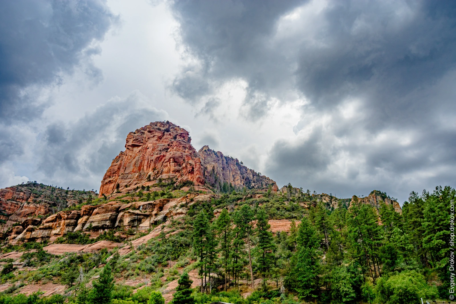 The majestic red rock formations of Sedona, Arizona, stand tall under a dramatic, cloudy sky. This natural wonder draws visitors seeking awe-inspiring landscapes and a connection with the earth's raw beauty.