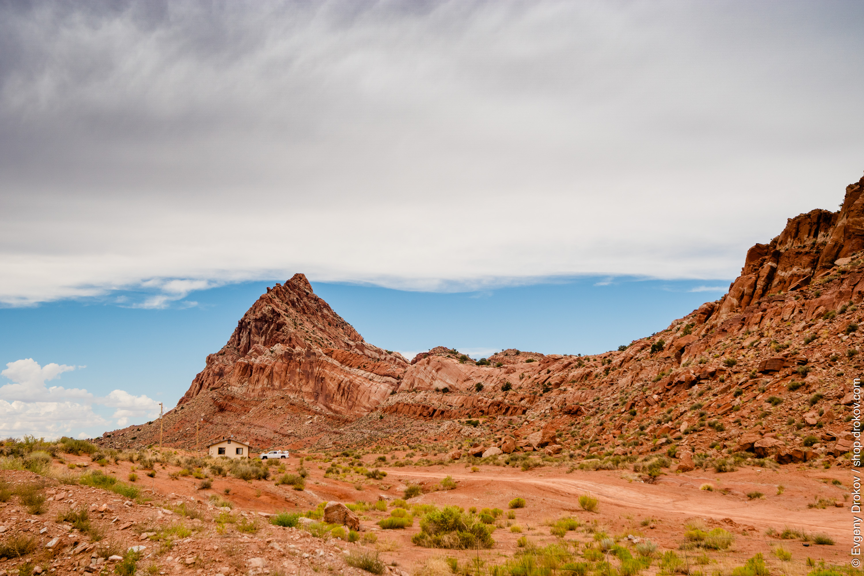A solitary house and pickup truck stand against the dramatic backdrop of red rock formations and sparse desert vegetation in Cameron, Arizona. This composition captures the stark beauty and isolation of the arid landscape.