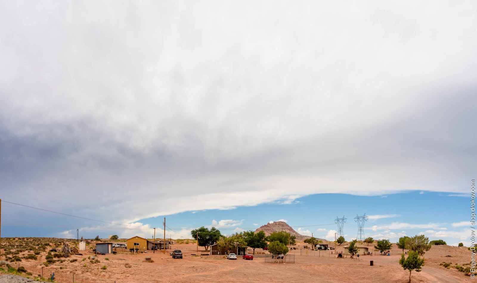 This is a rural settlement in Tuba City, Arizona, USA. The arid landscape, small buildings, parked vehicles, and utility poles depict a remote community. The cloudy sky indicates a dynamic weather system over the desert.